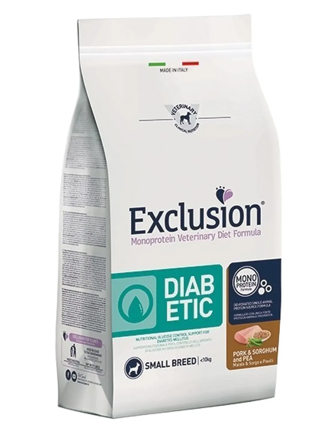 Właściwości: Exclusion Diet Diabetic Small Breed to kompletna dietetyczna karma dla dorosłych psów opracowana w celu kontrolowania spożycia glukozy w przebiegu cukrzycy. Ten kompletny dietetyczny pokarm ma niski poziom monosacharydów i disacharydów.