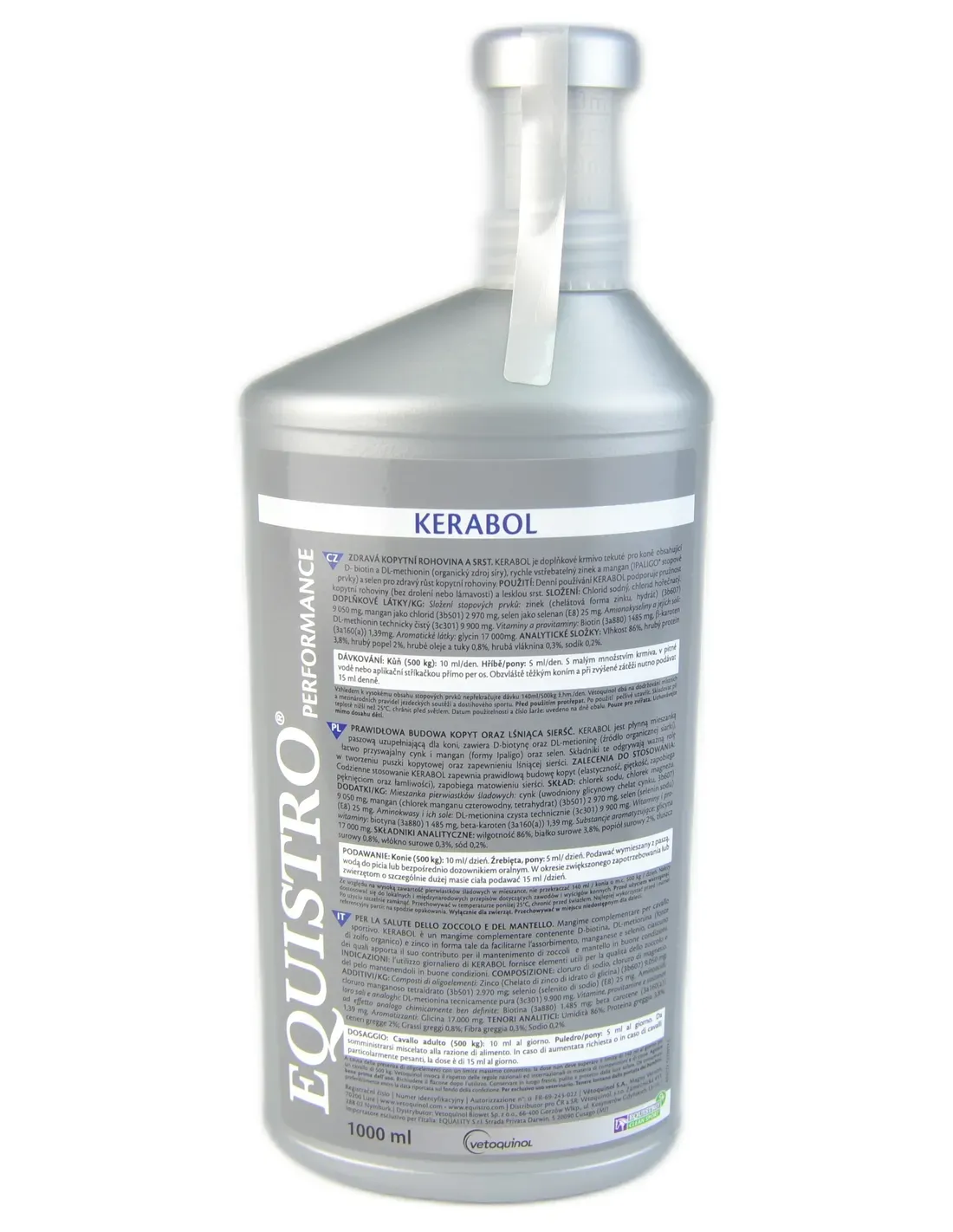 Składniki aktywne i składniki odżywcze: Kerabol Equistro zawiera zbilansowaną mieszankę niezbędnych aminokwasów, witamin z grupy B (w szczególności biotyny i witaminy B6), minerałów, takich jak cynk i miedź, oraz innych kofaktorów odżywczych niezbędnych do aktywacji enzymów odpowiedzialnych za syntezę tkanki rogowej.