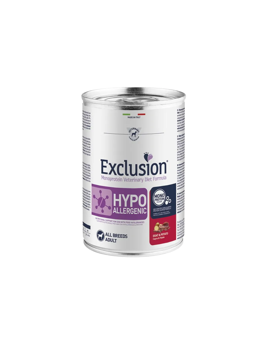 Exclusion Diet Hypoallergenic Duck and Potato została specjalnie opracowana do żywienia psów doświadczających niepożądanych reakcji na pokarm, takich jak zapalenie skóry, swędzenie, nawracające infekcje ucha, przewlekłe zaburzenia żołądkowo-jelitowe lub epizody biegunki i wymiotów związane z nadwrażliwością pokarmową. Nietolerancje pokarmowe i alergie u psów mogą powodować utrzymujące się objawy, które wpływają na jakość życia zwierzęcia i zmniejszają skuteczność innych metod leczenia. Ta monobiałkowa karma dla zwierząt (kaczka) i jednowodna (ziemniaki) eliminuje z diety główne źródła alergenów odpowiedzialnych za najczęstsze objawy kliniczne u naszych zwierząt, takie jak kurczak, wołowina, pszenica, laktoza i soja.