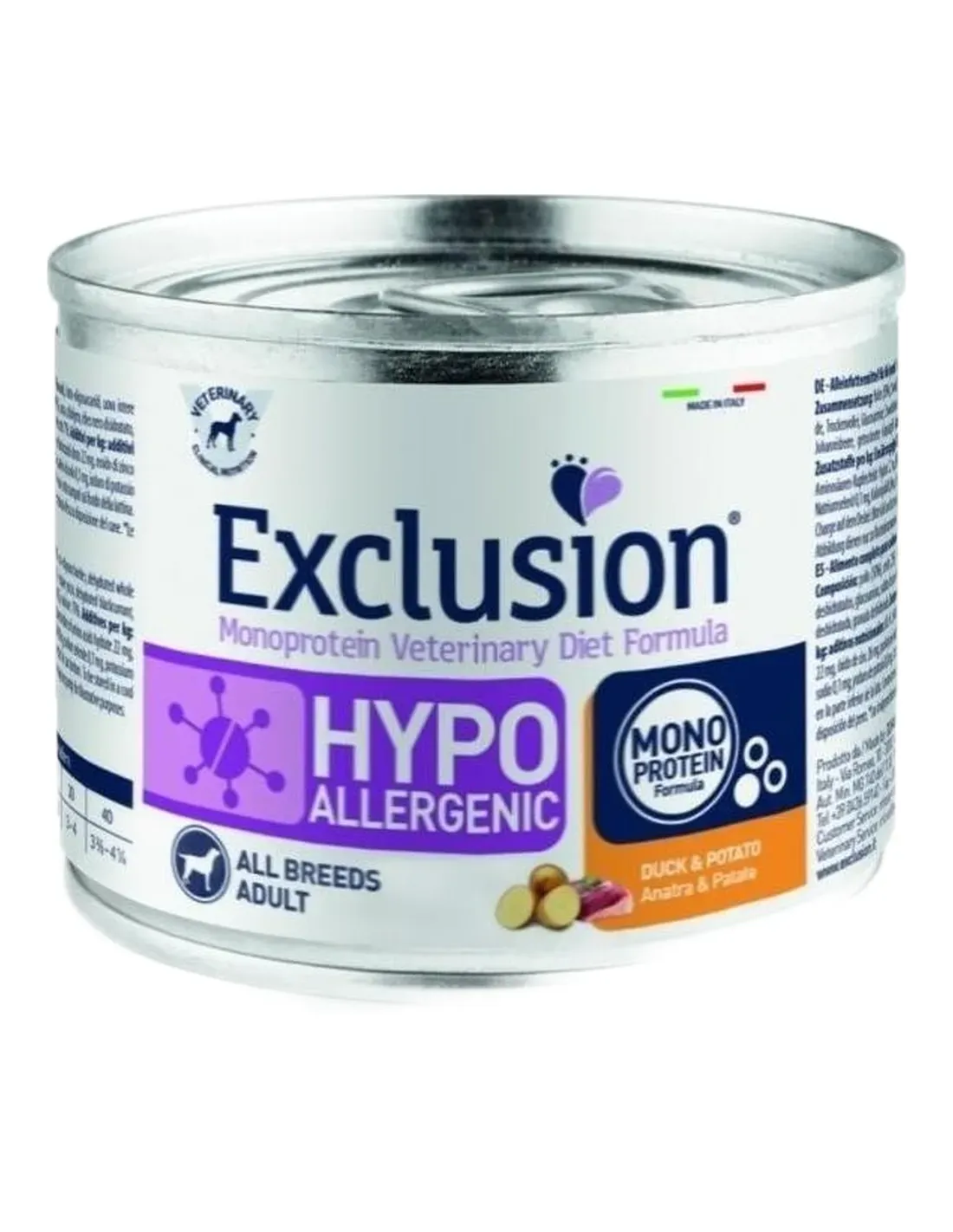 Exclusion Monoprotein Veterinary Diet Formula Hypoallergenic to dietetyczna karma zawierająca monoproteiny, sporządzona z jednego alternatywnego źródła białek zwierzęcych, innowacyjnych składników i konserwowana naturalnymi tokoferolami; reprezentuje odpowiedź żywieniową dostępną dla lekarza weterynarii, zróżnicowaną według wielkości, jako wsparcie żywieniowe dla psów z nietolerancją pokarmową.