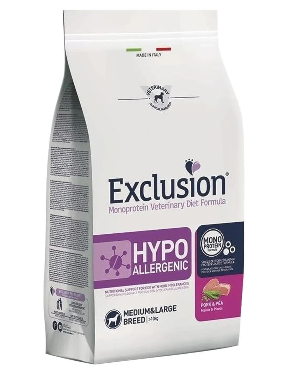 Exclusion Monoprotein Veterinary Diet Formula Hypoallergenic to dietetyczny pokarm zawierający formułę monobiałkową, sporządzony z jednego alternatywnego źródła białek zwierzęcych, innowacyjnych składników i konserwowany naturalnymi tokoferolami; reprezentuje odpowiedź żywieniową dostępną dla lekarza weterynarii, zróżnicowaną według wielkości, jako wsparcie żywieniowe dla psów z nietolerancją pokarmową.