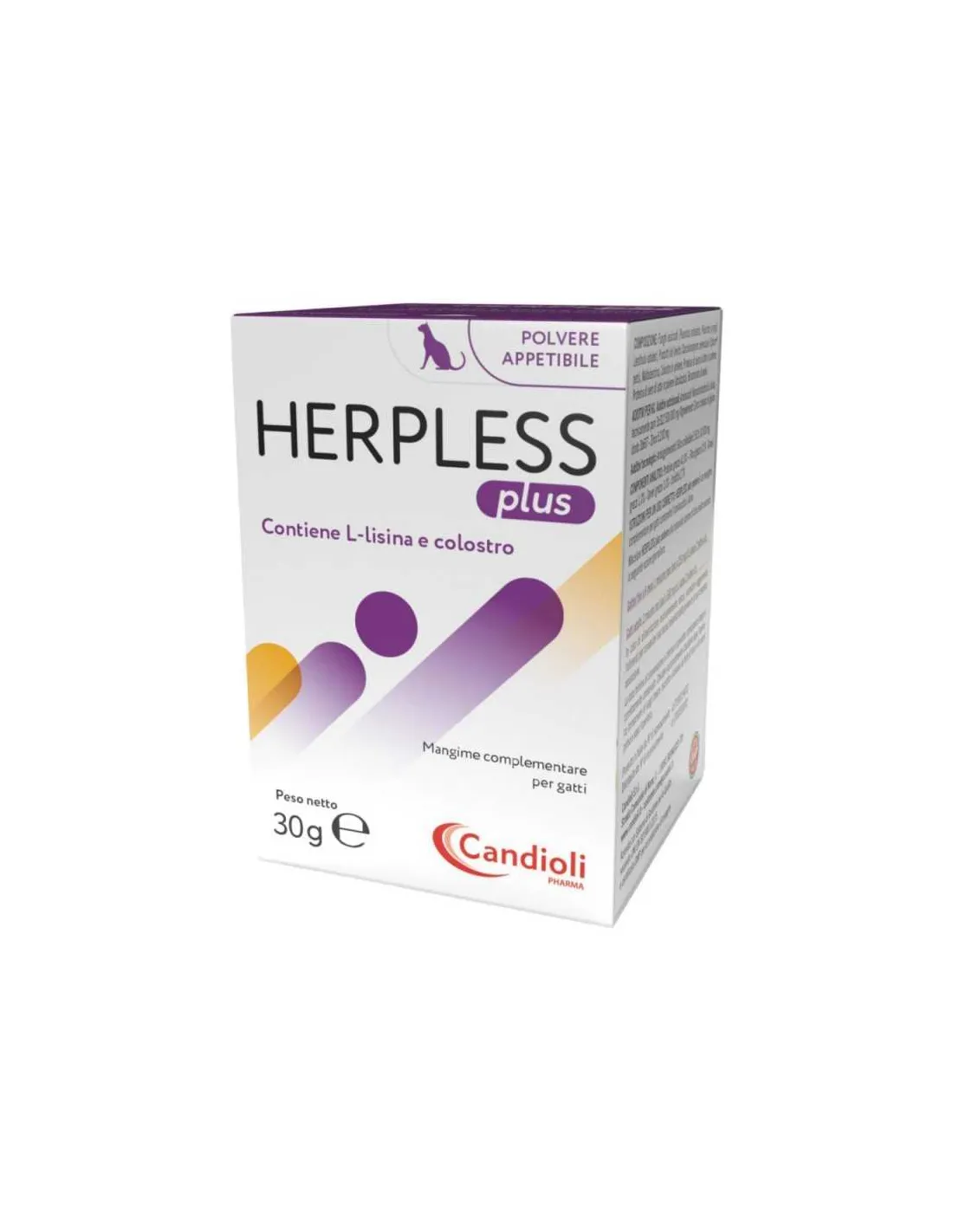 Candioli Herpless Plus to karma uzupełniająca dla kotów zamknięta w 30 g słoiczku z proszkiem. Produkt zawiera aminokwas L-lizynę i siarę i jest odpowiedni dla kotów w każdym wieku. Proszek można łatwo wymieszać z karmą dla kota, dzięki czemu podawanie jest proste i bezstresowe.