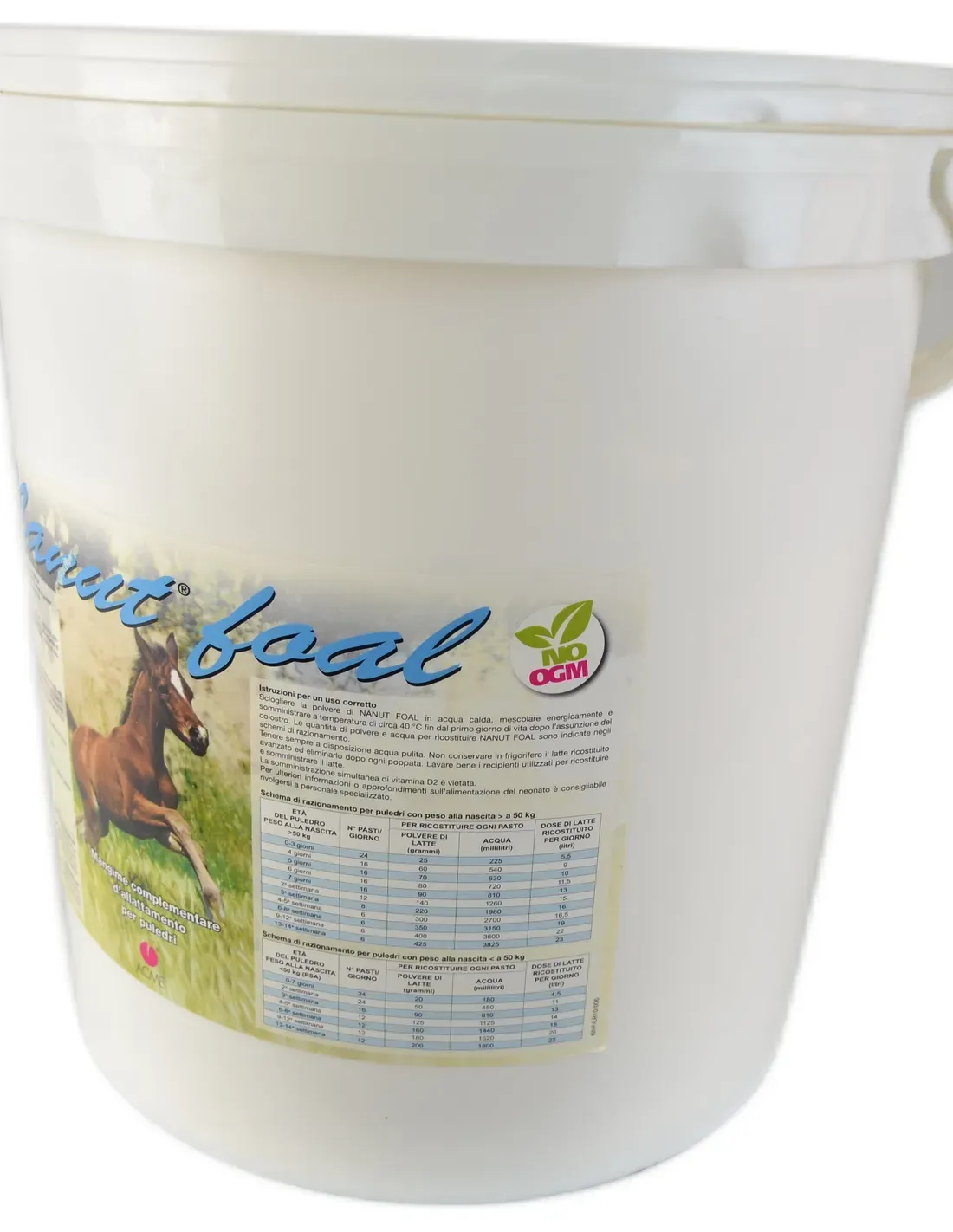 Rozpuścić 100 g proszku nanut na każde 1,5 litra gorącej wody. Energicznie mieszaj aż do uzyskania idealnego roztworu, który można podawać na ciepło już od pierwszego dnia życia po przyjęciu siary. W warunkach fizjologicznych nowonarodzony źrebak pobiera mleko w ilości odpowiadającej 20% jego masy. Chore źrebięta mogą mieć zwiększone zapotrzebowanie na energię nawet o 100%, np. w przypadku uogólnionej sepsy, zabiegów chirurgicznych, stresu termicznego, biegunki; w takich sytuacjach konieczna jest interwencja poprzez żywienie pozajelitowe w celu wsparcia żywienia źrebiąt nanutami. Poniższe średnie dawki odnoszą się do źrebiąt ras normalnych, ważących po urodzeniu 50 kg i rozwijających się zgodnie ze wzrostem fizjologicznym i bez patologii. Wyższe potrzeby żywieniowe należy zaspokoić poprzez zwiększenie częstotliwości karmienia, a nie ilości mleka przy każdym karmieniu. Wiek źrebiąt: 0-3 dni; ilość posiłków/dzień: 12; mleko w proszku/posiłek (g): 50; odtworzone mleko/posiłek (ml): 450; mleko odtworzone/dzień (litry): 5,4; wiek źrebiąt: 4 dni; ilość posiłków/dzień: 10; mleko w proszku/posiłek (g): 100; odtworzone mleko/posiłek (ml): 900; mleko odtworzone/dzień (litry): 9; wiek źrebiąt: 5 dni; ilość posiłków/dzień: 10; mleko w proszku/posiłek (g): 125; odtworzone mleko/posiłek (ml): 1125; mleko odtworzone/dzień (litry): 11,25; wiek źrebiąt: 6 dni; ilość posiłków/dzień: 10; mleko w proszku/posiłek (g): 130; odtworzone mleko/posiłek (ml): 1170; mleko odtworzone/dzień (litry): 11,7; wiek źrebiąt: 7 dni; ilość posiłków/dzień: 10; mleko w proszku/posiłek (g): 135; odtworzone mleko/posiłek (ml): 1215; mleko odtworzone/dzień (litry): 12,15; wiek źrebiąt: 2 tygodnie; ilość posiłków/dzień: 9; mleko w proszku/posiłek (g): 180; odtworzone mleko/posiłek (ml): 1620; mleko odtworzone/dzień (litry): 14,6; wiek źrebiąt: 3 tygodnie; ilość posiłków/dzień: 8; mleko w proszku/posiłek (g): 220; odtworzone mleko/posiłek (ml): 1980; mleko odtworzone/dzień (litry): 15,84; wiek źrebiąt: 4-5 tygodni; ilość posiłk��w/dzień: 6; mleko w proszku/posiłek (g): 300; odtworzone mleko/posiłek (ml): 2700; mleko odtworzone/dzień (litry): 16,2; wiek źrebiąt: 6-8 tygodni; ilość posiłków/dzień: 6; mleko w proszku/posiłek (g): 350; odtworzone mleko/posiłek (ml): 3150; mleko odtworzone/dzień (litry): 18,9; wiek źrebiąt: 9-12 tygodni; ilość posiłków/dzień: 6; mleko w proszku/posiłek (g): 400; odtworzone mleko/posiłek (ml): 3600; mleko odtworzone/dzień (litry): 21,6; wiek źrebiąt: 13-14 tygodni; ilość posiłków/dzień: 6; mleko w proszku/posiłek (g): 425; odtworzone mleko/posiłek (ml): 3825; mleko odtworzone/dzień (litry): 22,95. W pierwszym dniu życia spożycie orzeszków ziemnych może się różnić w zależności od możliwego spożycia siary.