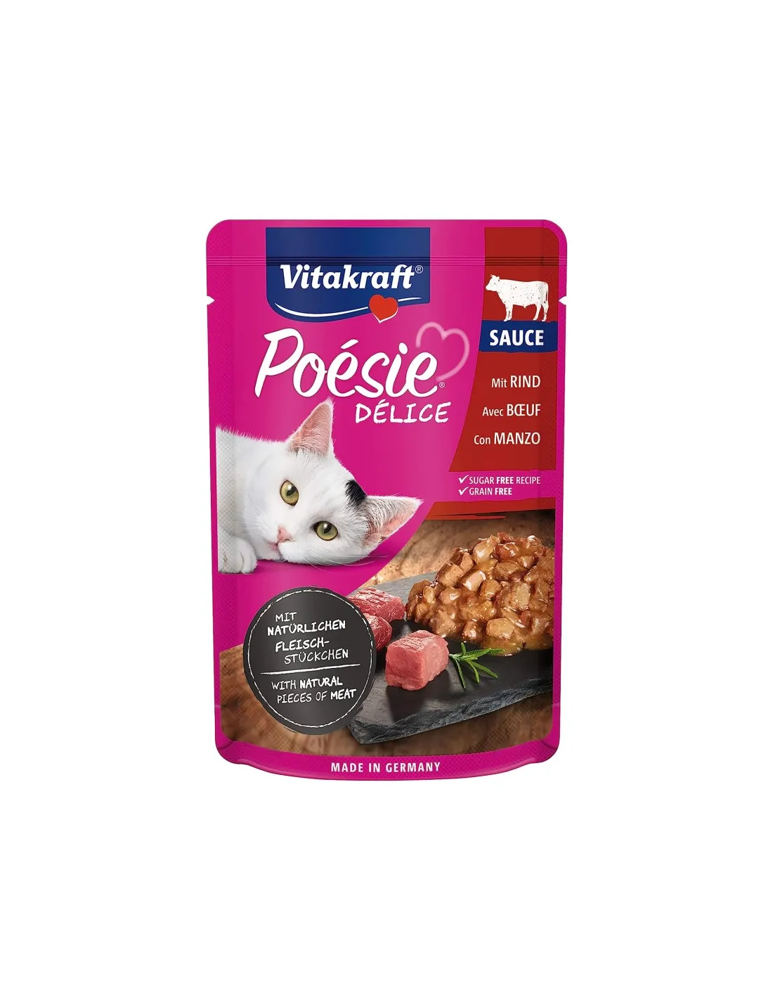 Vitakraft Cat Poesie Delice to mokra karma dla kotów, pakowana w praktyczne 85 gramowe opakowanie. Ten produkt oferuje pyszny i pożywny posiłek dla Twojego kociego przyjaciela o nieodpartym smaku wołowiny.