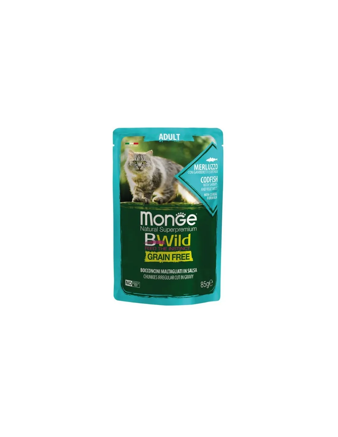 „Monge Natural Super Premium Bwild Grain Free Formula Adult Cat Dorsz z krewetkami i warzywami (fasolka szparagowa i marchewka)” to kompletna i zbilansowana karma opracowana specjalnie dla dorosłych kotów. Produkt ten jest idealny dla codziennego dobrego samopoczucia kota, dzięki swojej formule bez zbóż i obecności wysokiej jakości składników, takich jak dorsz, krewetki i wybór świeżych warzyw, takich jak fasolka szparagowa i marchewka.