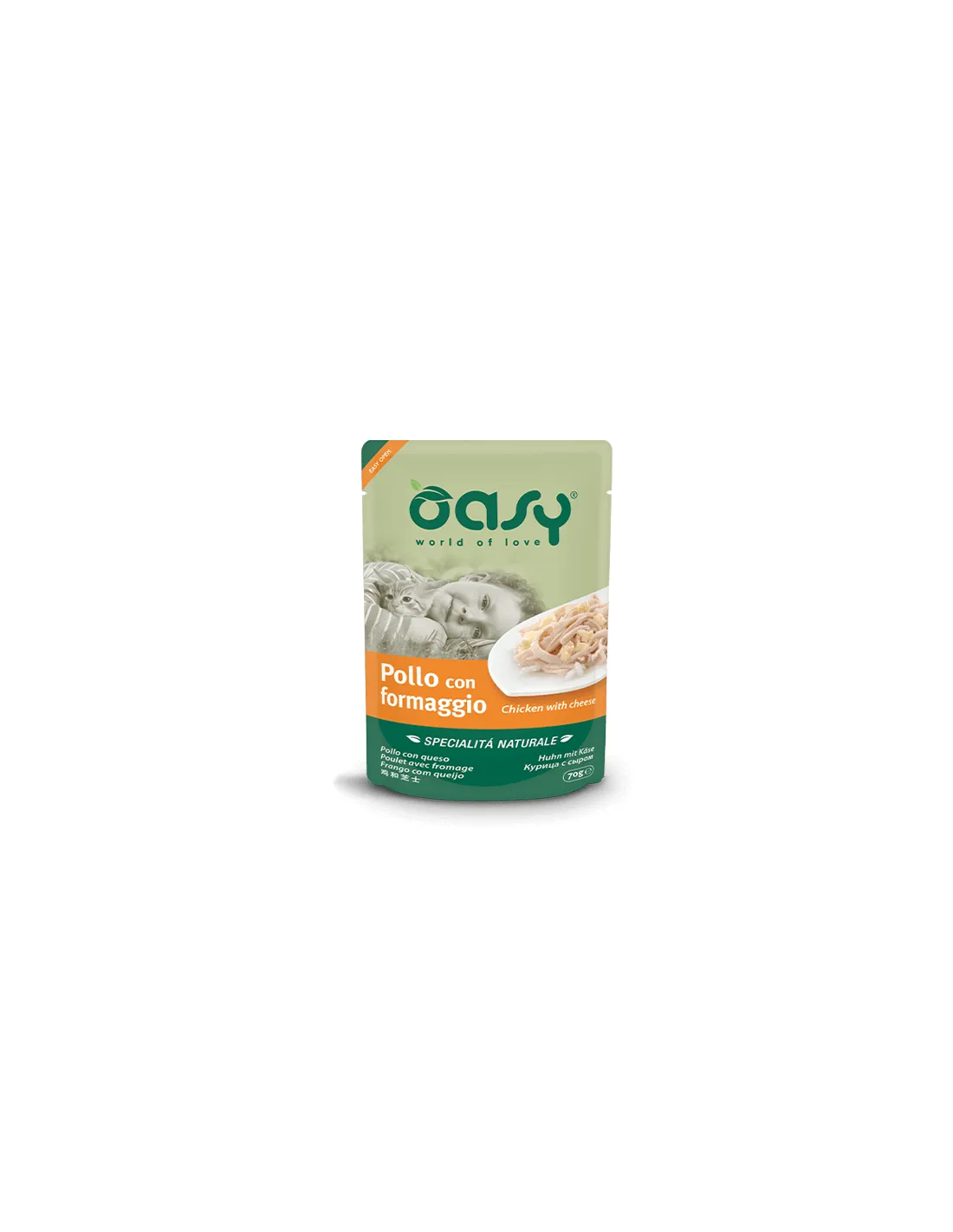 Oasy Cat Natural Specialties Kurczak z Serem torebka 70 g to mokra karma dla kotów, która łączy w sobie pyszny smak kurczaka z bogatym aromatem sera. Ten produkt idealnie zaspokaja potrzeby żywieniowe Twojego kota, zapewniając smaczny i zdrowy posiłek.
