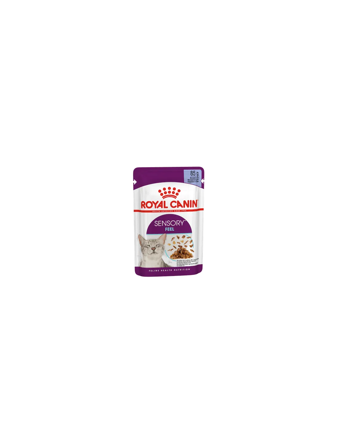 Sensory™ FEEL jelly strips to mokra karma dla dorosłych kotów, dostępna w opakowaniach 85 g, zaprojektowana tak, aby zapewniać wyjątkowe doznania sensoryczne i stymulować ogólne samopoczucie kota.