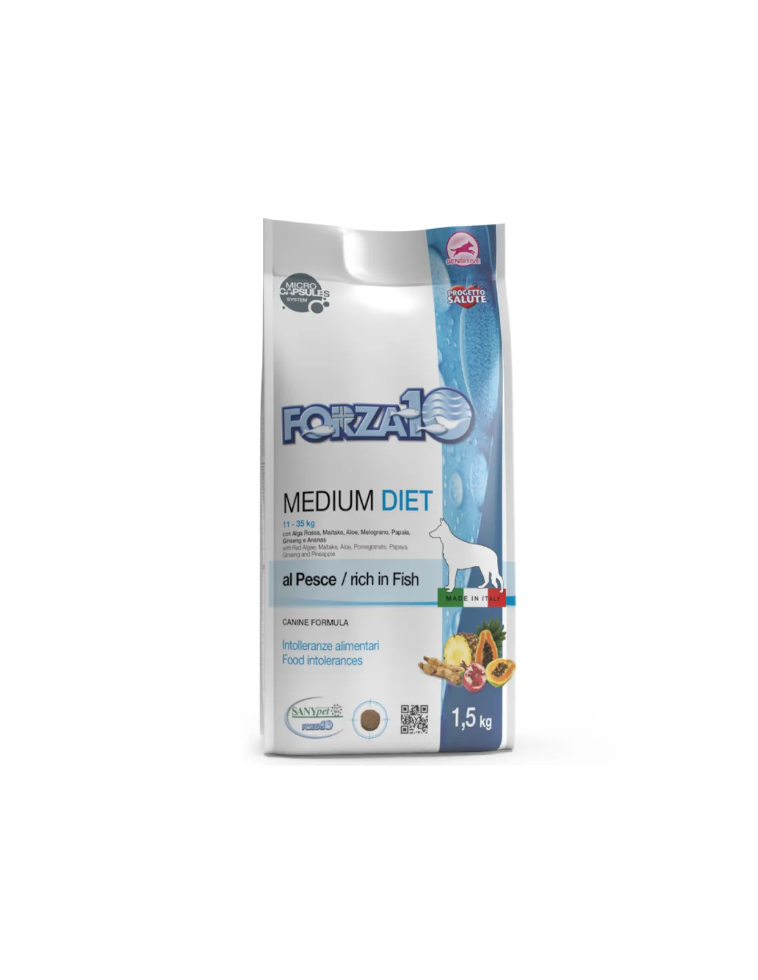Forza10 Diet Medium Fish została opracowana specjalnie dla psów średniej wielkości i posiada właściwości odżywcze odpowiednie dla tej kategorii, gwarantując bezpieczeństwo i tolerancję nawet w warunkach wrażliwego układu trawiennego dzięki doborowi hipoalergicznych i wysokiej jakości składników.