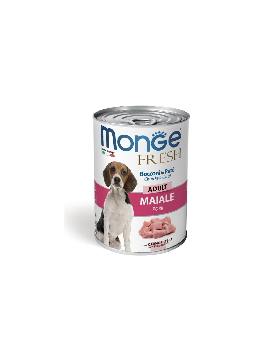 Monge Fresh Bites in Paté with Pork – Adult to kompletna i zbilansowana karma dla dorosłych psów, łącząca delikatne kawałki w pasztecie ze świeżą wieprzowiną. Formuła tego produktu zapewnia wysoką strawność i wysoką wartość biologiczną, dzięki czemu idealnie nadaje się do codziennej diety Twojego dorosłego psa.