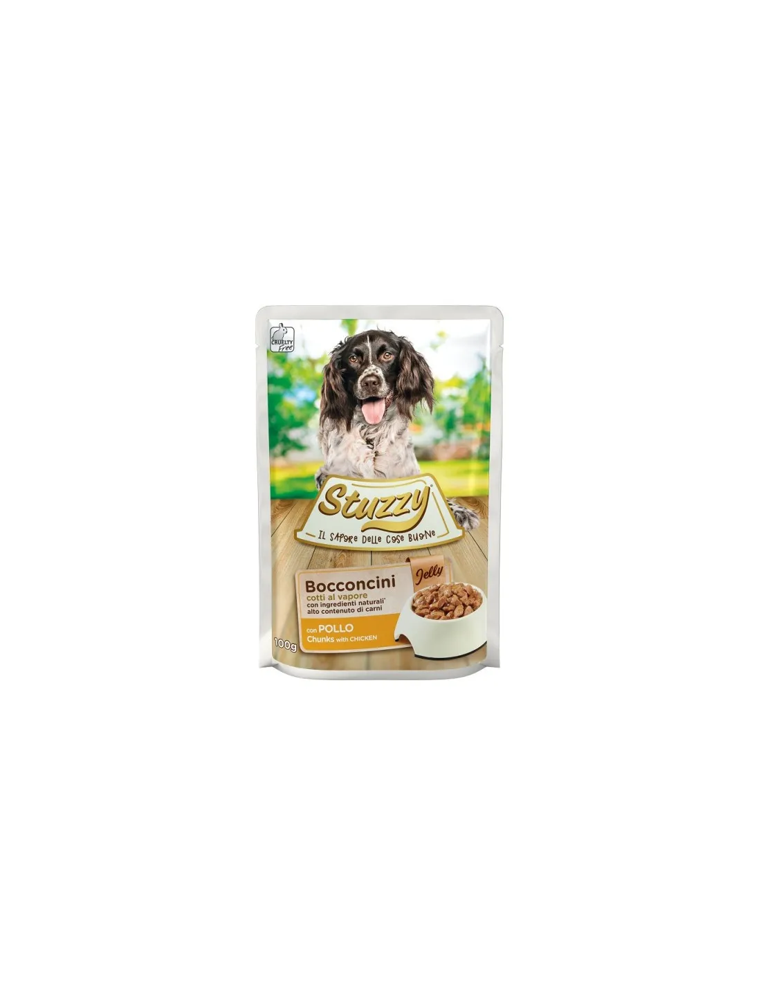 Stuzzy Dog Jelly Chicken 100 g to uzupełniająca mokra karma dla dorosłych psów, oferująca zbilansowane i pyszne odżywianie w każdej saszetce. Produkt ten jest dostępny w kilku wariantach smakowych, obejmujących kurczaka, rybę oceaniczną i cielęcinę z fasolką szparagową, aby zaspokoić preferencje każdego psa.