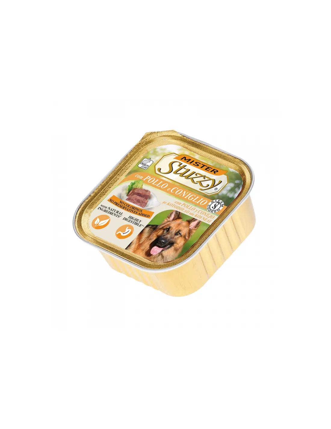 Stuzzy Patè Kurczak i Królik to mokra karma dla psów w 300 gramowej tacce. Produkt ten jest idealny dla dorosłych psów wszystkich ras, oferując kompletną i zbilansowaną dietę. Wykonane z naturalnych składników, w tym kurczaka i królika, jest gotowane na parze, aby zachować nienaruszone właściwości odżywcze i autentyczny smak mięsa.