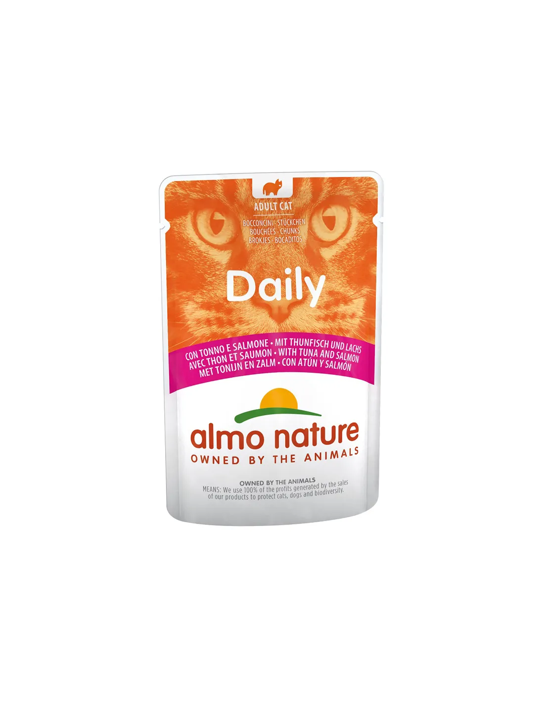 Almo Cat Daily Menu to mokra karma dla kotów dostępna w praktycznym opakowaniu 70 gramów, która łączy w sobie smak tuńczyka i łososia, zapewniając Twojemu kotu smaczny i pożywny posiłek.