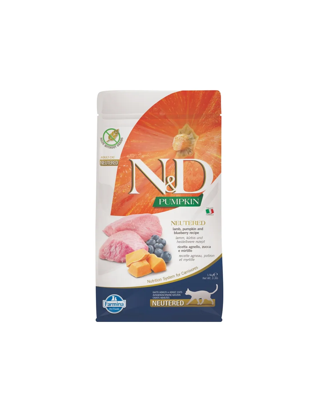 Opis produktu N&D Dynia Kot Jagnięcina Neut. 1,5 kg to kompletna karma dla dorosłych sterylizowanych kotów, zawierająca jagnięcinę, dynię i jagody, bez zbóż.