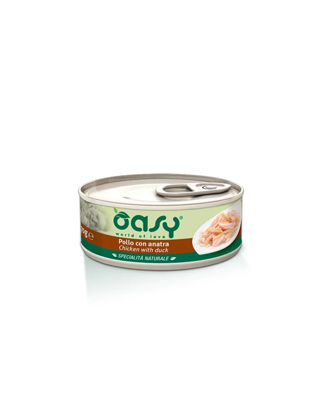„Oasy Mokra Kot – KURCZAK Z KACZKĄ puszka 150g” to wysokiej jakości mokra karma dla kotów, która zapewnia smaczną i pożywną dietę. Produkt ten jest idealny dla właścicieli kotów, którzy chcą zapewnić swoim kocim przyjaciołom posiłek pełen smaku i naturalnych składników. Główny skład tej karmy obejmuje świeżego kurczaka i kaczkę, które łącznie stanowią prawie 50% całkowitej zawartości karmy, gwarantując w ten sposób spożycie białka najwyższej jakości. Ponadto obecność ryżu stanowi źródło łatwo przyswajalnych węglowodanów, przyczyniając się do zbilansowania odżywczego posiłku.