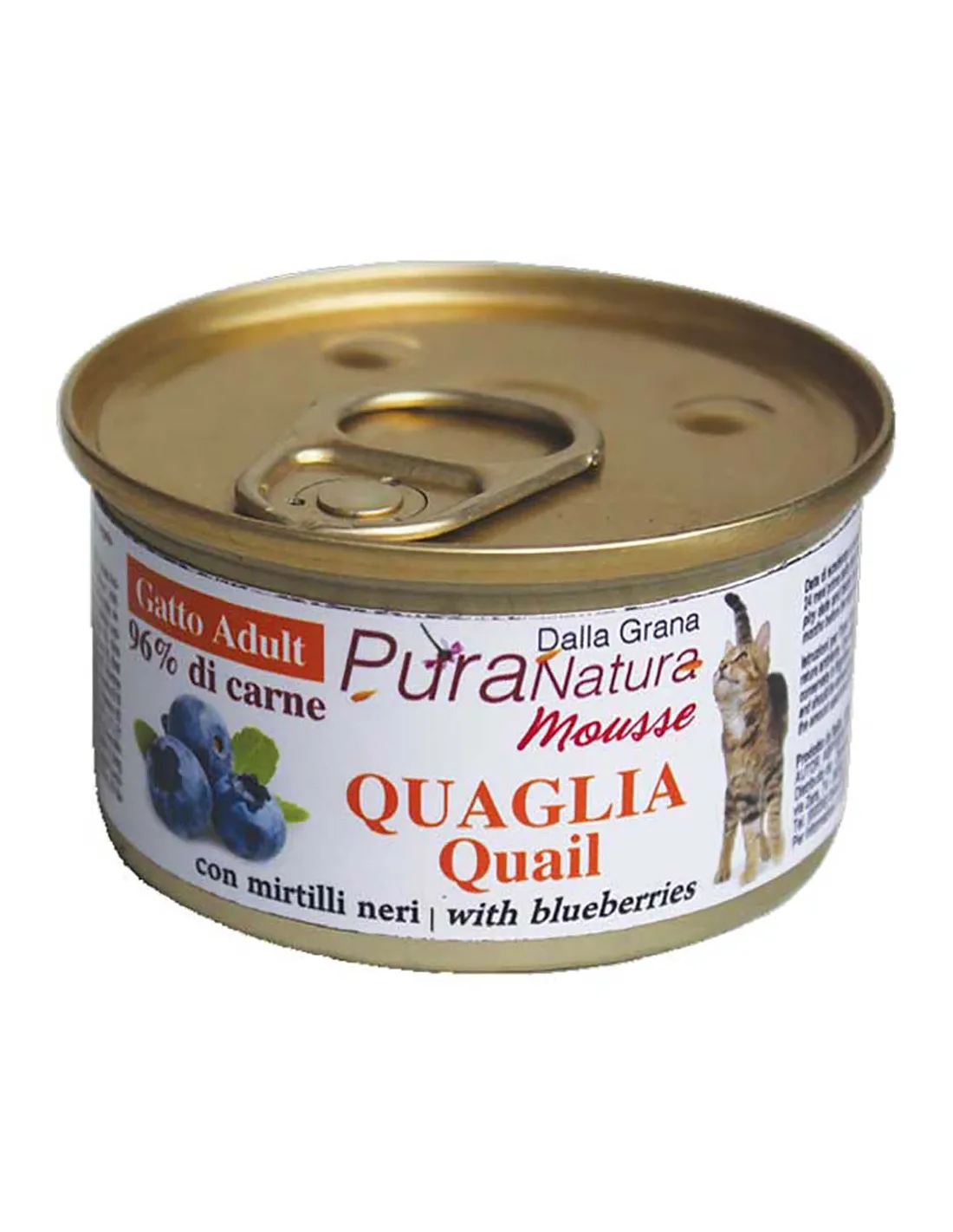 Pura Natura Mokra karma dla dorosłych kotów z przepiórkami i jagodami to kompletna i zbilansowana karma, opracowana z myślą o zaspokojeniu potrzeb żywieniowych dorosłych kotów. Ten wysokiej jakości mus powstał z wyselekcjonowanych składników, w tym przepiórki jako głównego źródła białka i jagód, znanych ze swoich właściwości przeciwutleniających.