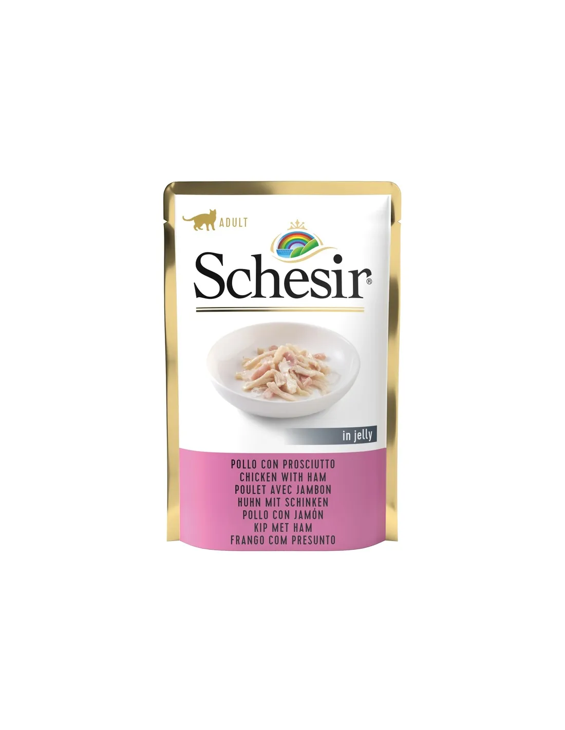 Skład Schesir opiera się w 100% na naturalnych składnikach, starannie wyselekcjonowanych i gotowanych na parze, aby zachować ich właściwości odżywcze. Kurczakowi, głównemu składnikowi, towarzyszy dodatek szynki, który dodaje odrobinę nieodpartego smaku. Obecność ryżu gwarantuje spożycie łatwo przyswajalnych węglowodanów, natomiast żelatyna pomaga w przyjmowaniu płynów, które są niezbędne dla zdrowia nerek kotów.
