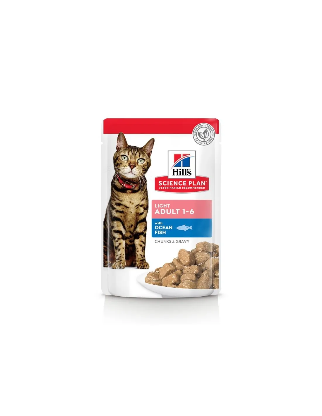 Hill's Science Plan Cat Adult Light with Fish to karma dla dorosłych kotów o pysznym smaku ryby oceanicznej. Produkt zapakowany w praktyczną torebkę o gramaturze 85 gramów, idealną na pojedynczą porcję. Jest częścią słynnej linii „Science Plan” firmy Hill, znanej z dbałości o zdrowie i dobre samopoczucie zwierząt domowych. Ta szczególna formuła została zaprojektowana tak, aby była lekka, co czyni ją idealną opcją dla kotów wymagających kontrolowanej lub niskokalorycznej diety.
