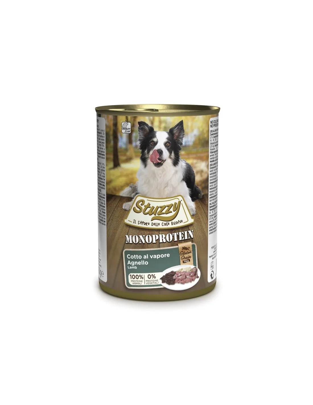 Dostępna w puszkach 400 gramowych, Stuzzy Dog Monoprotein oferuje różnorodne smaki odpowiadające preferencjom każdego psa: jagnięcina, dziczyzna, dzik, wieprzowina, wołowina, kurczak, indyk, cielęcina oraz specjalna wersja ze śledziem i ziemniakami. Każdy wariant jest bogaty w świeże mięso o zawartości 70%, któremu towarzyszy bulion, substancje mineralne i odrobina oleju lnianego, który pomaga zapewnić niezbędne nienasycone kwasy tłuszczowe dla zdrowych włosów i skóry.