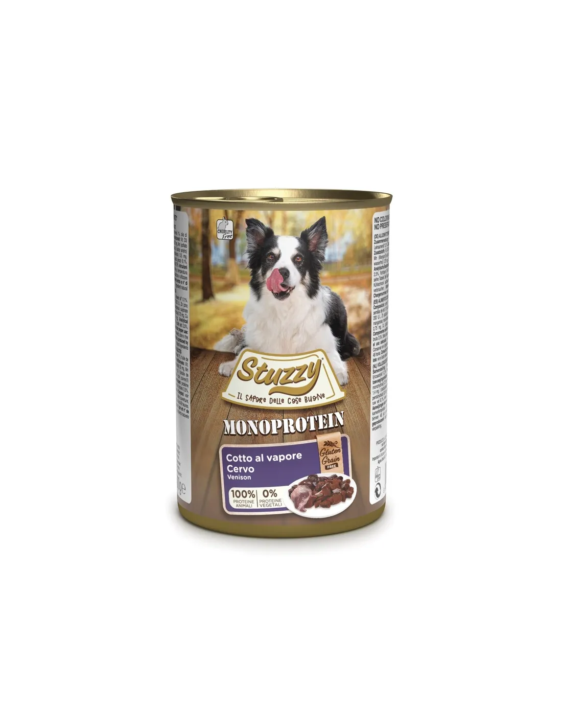 Stuzzy Monoprotein Cervo to kompletna mokra karma dla dorosłych psów, dostępna w praktycznej puszce 400g. Produkt ten wyróżnia się monobiałkową formułą, zawierającą 70% wysokiej jakości mięsa jelenia, co gwarantuje optymalne i specyficzne spożycie białka. Pozostałe 30% to substancje mineralne i olej lniany, elementy niezbędne do utrzymania optymalnego zdrowia czworonożnego przyjaciela. Jej ekskluzywna receptura nie zawiera białek roślinnych, dzięki czemu jest idealna dla psów z wrażliwością lub nietolerancją pokarmową. Gotowanie na parze zapewnia maksymalną strawność i zachowanie autentycznego smaku mięsa, dzięki czemu każdy posiłek będzie dla Twojego psa chwilą czystej przyjemności. Zalecana dzienna porcja różni się w zależności od wagi psa i można ją łatwo sprawdzić na stronie internetowej, co pozwala na zbilansowaną dietę dostosowaną do indywidualnych potrzeb.