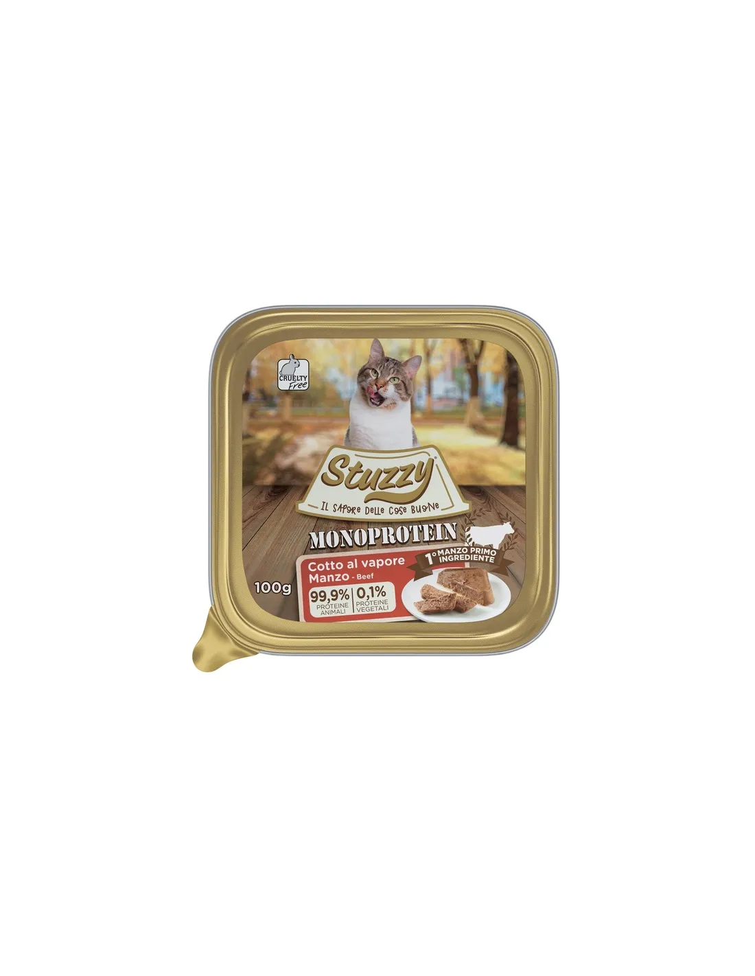 „Stuzzy Monoprotein Beef” to mokra karma dla dorosłych kotów, która wyróżnia się monobiałkową formułą, idealną do zaspokojenia potrzeb żywieniowych kota za pomocą jednego rodzaju białka zwierzęcego. Skład produktu jest starannie zbilansowany o mięso i jego pochodne (60% wołowiny), produkty uboczne pochodzenia roślinnego, substancje mineralne oraz dodatki odżywcze takie jak witamina D3, witamina E, biotyna, tauryna, cynk i mangan. Składniki analityczne mają na celu zapewnienie pełnego odżywienia: białko 10%, tłuszcze surowe 4,5%, włókno surowe 0,3%, popiół surowy 1,8% i wilgotność 81%. Gotowanie na parze zapewnia zachowanie właściwości odżywczych i lekkości posiłku, dzięki czemu każda taca będzie przyjemnością dla podniebienia Twojego kota.