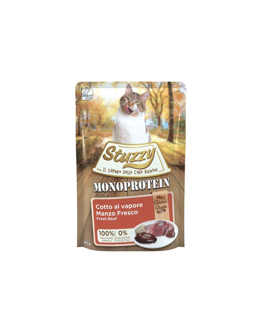 STUZZY „monoproteinowa wołowina dla kotów” to wysokiej jakości mokra karma dla dorosłych kotów, pakowana w praktyczne saszetki 85g. Produkt ten wyróżnia się monobiałkową formułą, która wykorzystuje wyłącznie wołowinę jako jedyne źródło białka zwierzęcego, dzięki czemu jest idealny dla kotów z wrażliwością pokarmową lub specjalną dietą. Receptura została starannie zbilansowana, aby zapewnić wszystkie niezbędne składniki odżywcze, zapewniając kotu dobre samopoczucie i zdrowie.