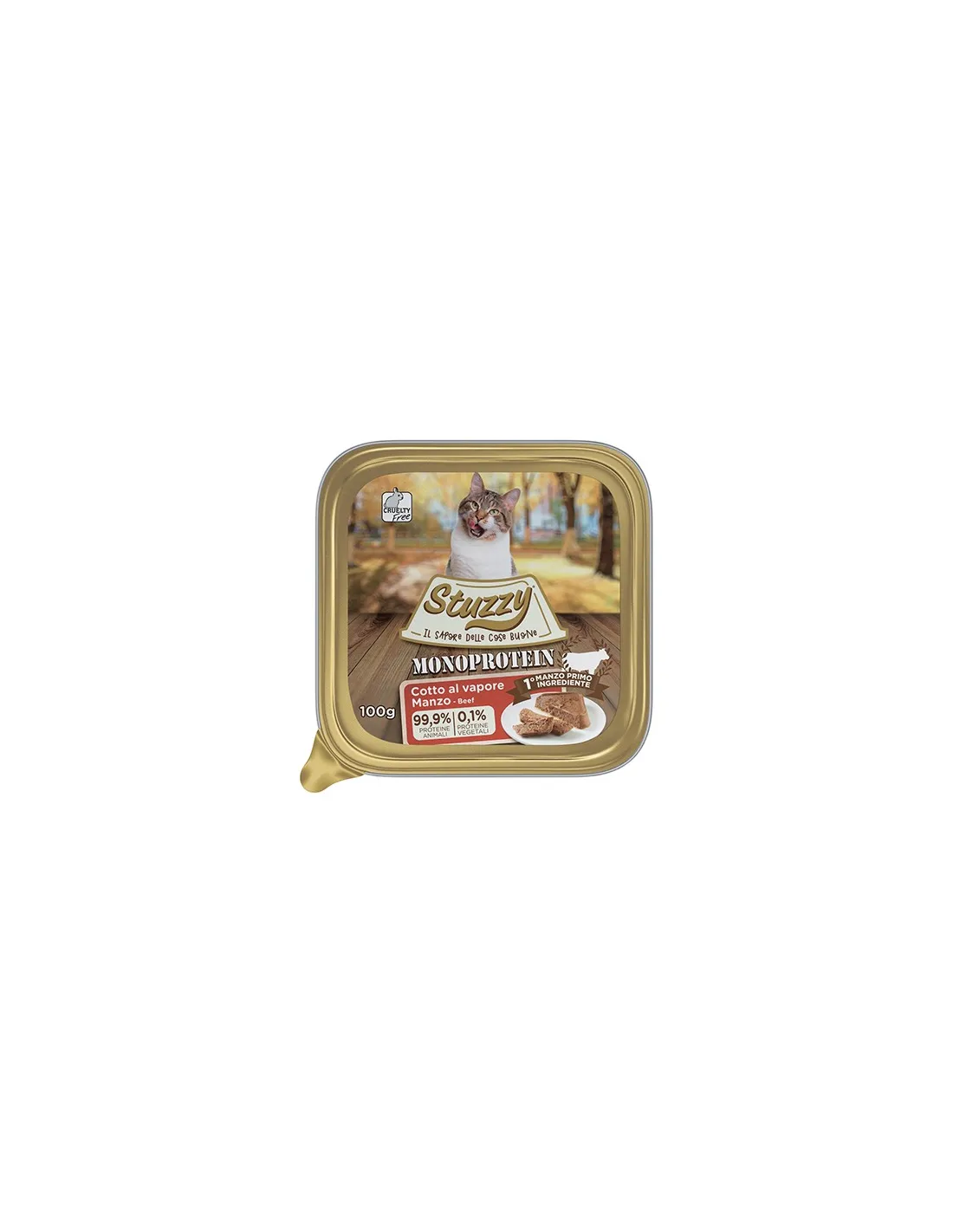 Stuzzy Monoprotein Beef to mokra karma dla dorosłych kotów w opakowaniu 100g. Produkt składa się w 99,9% z białek zwierzęcych i 0,1% z białek roślinnych, co gwarantuje jedno źródło białka zwierzęcego. Wykorzystywane mięso jest gotowane na parze, metodą zachowującą delikatność wyselekcjonowanych naturalnych składników i zapewniającą lekkość produktu. Stuzzy Monoprotein Beef jest idealna do karmienia Twojego kota całą dobrocią autentyczności.