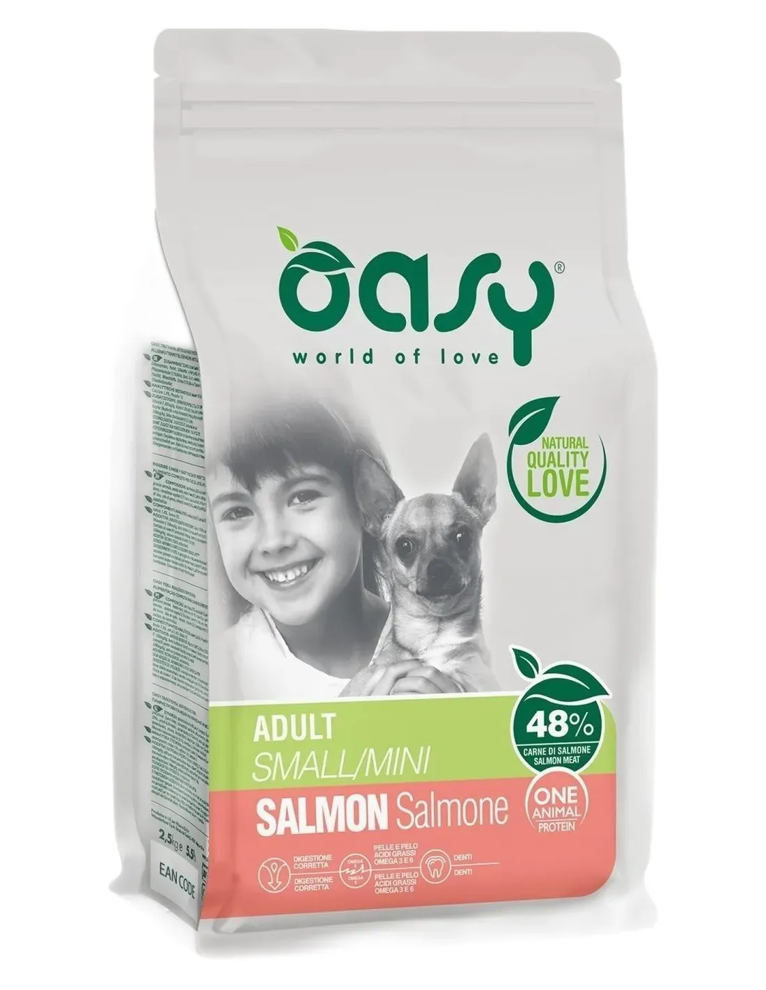 SKŁAD: świeży łosoś 30%, ryż, suszony łosoś 15%, białko ryżowe, tłuszcz zwierzęcy, hydrolizowany łosoś 3%, pulpa buraczana 2,5%, drożdże piwne 1%, substancje mineralne, olej rybny, inulina 1000 mg/kg (źródło fruktooligosacharydów), imbir 0,1%, mannanooligosacharydy 1000 mg/kg, jukka schidigera 170 mg/kg.SKŁADNIKI ANALITYCZNE: białko surowe 28%, tłuszcze surowe 17%, kwasy tłuszczowe Omega-6 2,55%, kwasy tłuszczowe Omega-3 0,65%, EPA + DHA 2850 mg/kg, włókno surowe 2,8%, popiół surowy 7%, wapń 1,35%, fosfor 1%, wilgotność 9%.
