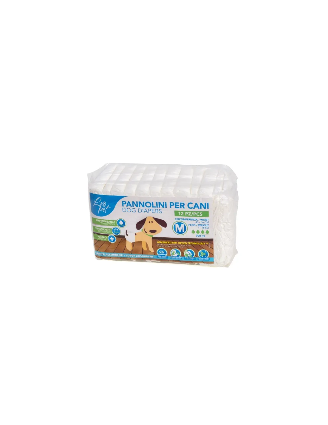 Ten produkt jest dostępny w formacie 12 sztuk, idealnych do zapewnienia wystarczającej ilości pokarmu, abyś mógł bez obaw zadbać o higienę swojego psa. Każda pieluszka jest odpowiednia dla psów średniej wielkości, a jej obwód jest odpowiedni dla psów o rozmiarze od 45 do 60 cm.