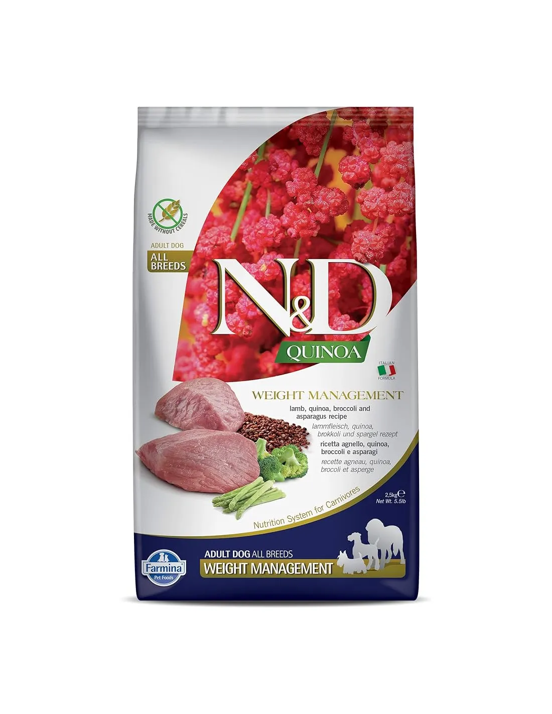 Farmina n&d quinoa dog kontroli wagi jagnięcina 2,5 kg to kompletna karma dla dorosłych psów na bazie jagnięciny, komosy ryżowej, brokułów i szparagów. Przydatny w przywracaniu i utrzymywaniu idealnej wagi u osób ze skłonnością do nadwagi.