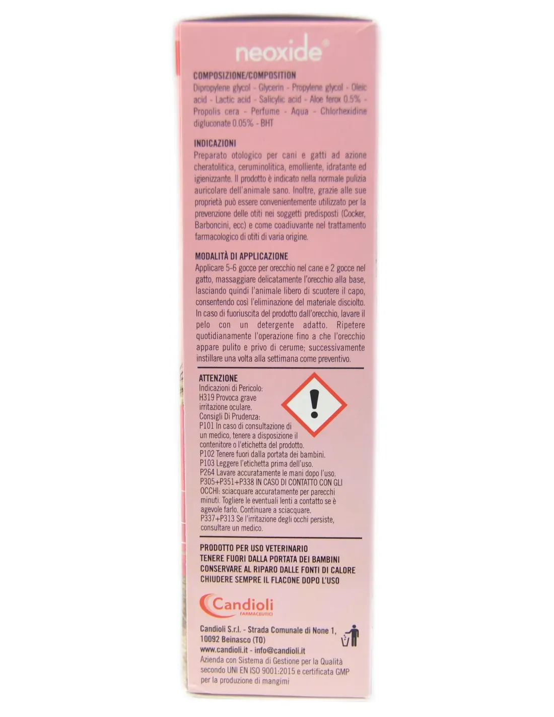 Zastosuj 5-6 kropli do ucha u psów i 2 krople u kotów, delikatnie masuj ucho u nasady, pozwalając zwierzęciu na swobodne potrząsanie głową, umożliwiając w ten sposób usunięcie rozpuszczonego materiału. Jeżeli produkt wycieknie z ucha, należy umyć włosy odpowiednim detergentem. Powtarzaj operację codziennie, aż ucho będzie wyglądało na czyste i wolne od woskowiny; następnie zaszczepiaj raz w tygodniu zapobiegawczo.