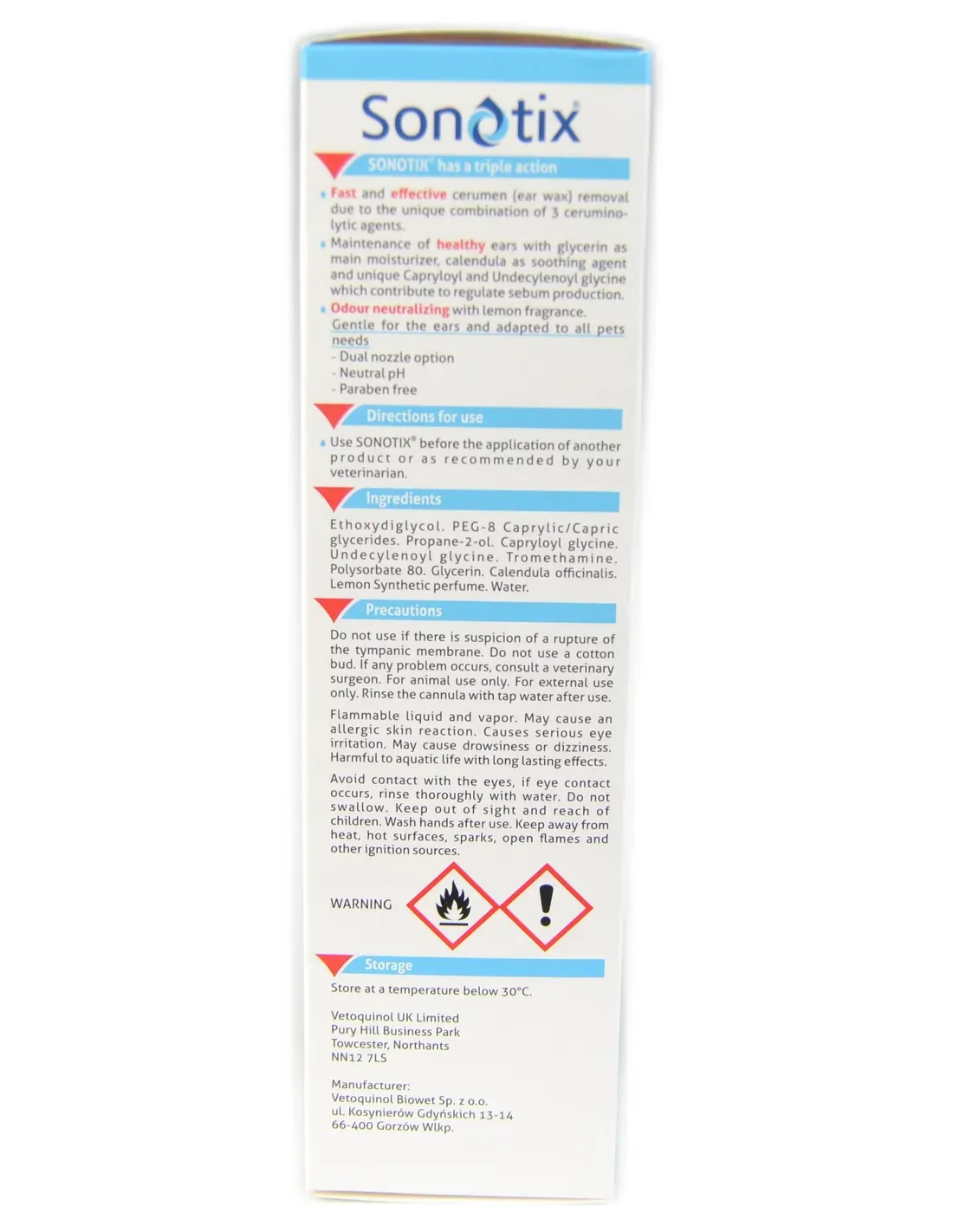 Głębokie oczyszczenie przewodu słuchowego przed zastosowaniem kolejnego preparatu lub zgodnie z zaleceniami lekarza weterynarii. Kompletna formuła Sonotix zapewnia potrójne działanie: szybko i skutecznie usuwa woskowinę dzięki unikalnej kombinacji 3 środków ceruminolitycznych; utrzymuje uszy w zdrowiu dzięki glicerynie jako głównemu składnikowi nawilżającemu, nagietkowi jako działaniu łagodzącemu oraz glicynie kapryloilowej i undecylenoilowej, które regulują wydzielanie sebum; neutralizuje przykry zapach dzięki cytrynowemu zapachowi.