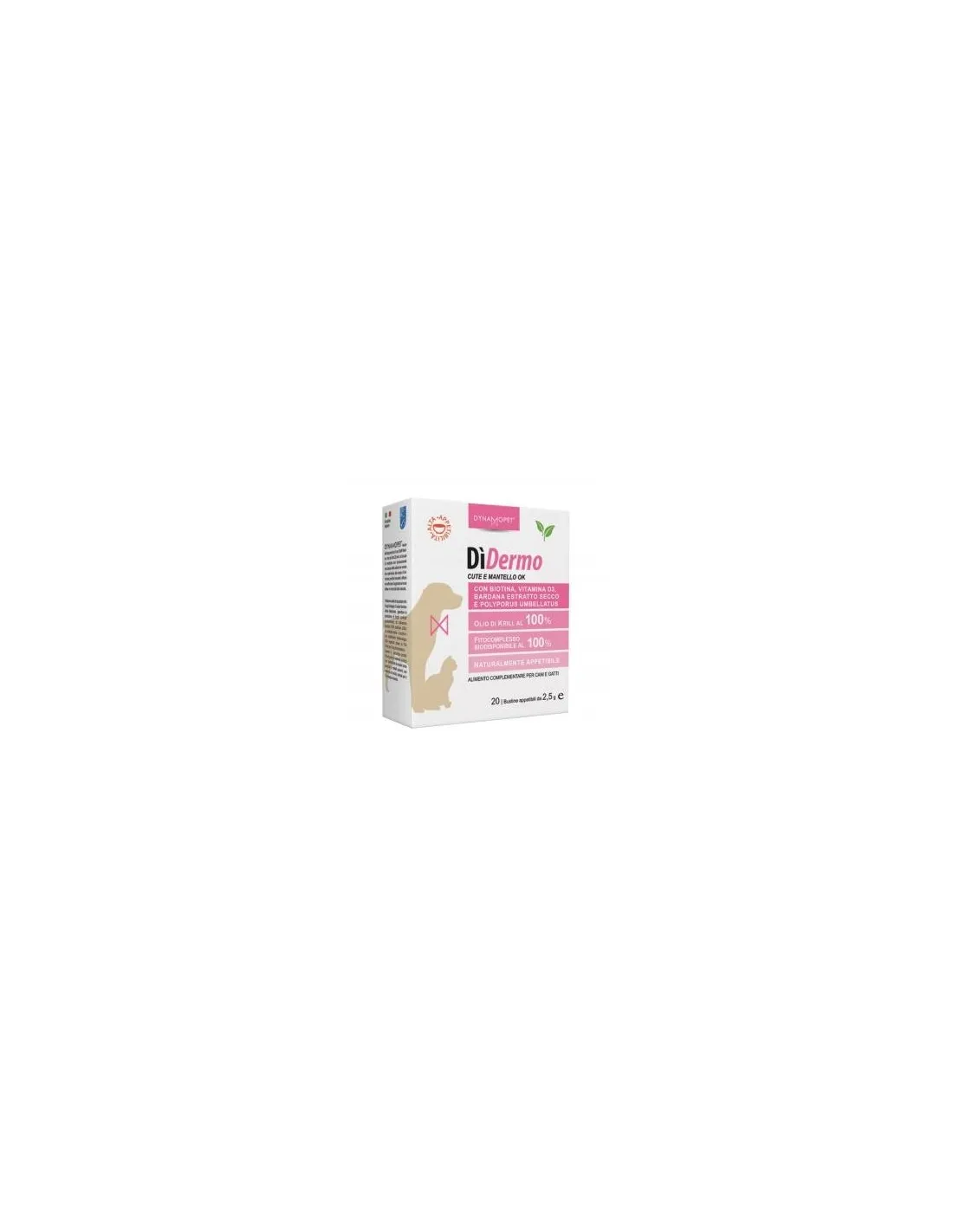 DìDERMO to pokarm uzupełniający, pomocny w utrzymaniu fizjologicznego dobrego samopoczucia skóry i przydatków skóry podczas procesów zapalnych i infekcyjnych. Dobrostan i prawidłowy trofizm skóry zwierzęcia jest szczególnie ważny w przypadku chorób alergicznych i zakaźnych. Formuła została wzbogacona kwasami Omega 3 z oleju z kryla i biotyną. Zawarte w nim fitokompleksy w połączeniu z obecnością w formule Omega3 z czystego oleju z kryla o doskonałej przyswajalności sprawiają, że jest to produkt wyjątkowy i niezbędny dla dobrego samopoczucia zwierzęcia. Produkt charakteryzuje się także dużą łatwością podawania, jest dobrze akceptowany i doceniany przez podniebienie zwierzęcia na tyle, że można go podawać samodzielnie lub jako dodatek do normalnego posiłku, bez ryzyka nie przyjęcia lub odmowy przyjęcia samego posiłku.