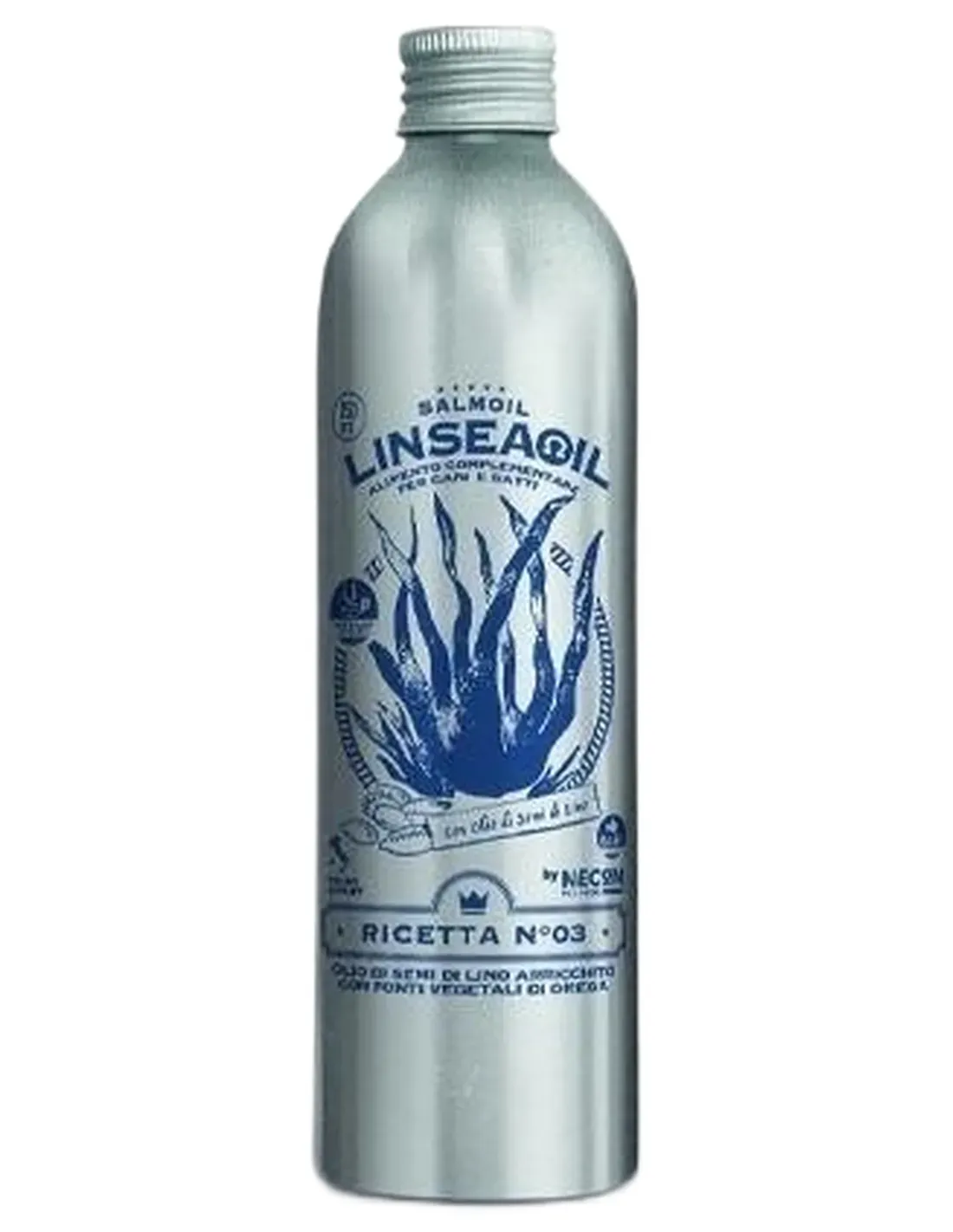 Karma uzupełniająca dla psów i kotów Olej lniany receptura 3, dzięki zastosowaniu surowców pochodzenia wyłącznie roślinnego, może być stosowana jako źródło Omega 3 zarówno w dietach wykluczających dla zwierząt uczulonych lub nietolerujących białek zwierzęcych, jak i w dietach wegetariańskich lub wegańskich, zarówno przemysłowych, jak i domowych. LINSEAOIL Salmoil Recipe 3, dzięki zastosowaniu surowców wyłącznie pochodzenia roślinnego, nadaje się dla zwierząt uczulonych lub nietolerujących białek zwierzęcych, ale także na diecie wegetariańskiej lub wegańskiej. Wskazany jest jako składnik diety Barf zarówno dla psów jak i kotów. Dzięki zdobytemu doświadczeniu w Necon Pet Food udało nam się znaleźć najlepsze składniki do stworzenia Linseaoil, linii pokarmów uzupełniających przygotowywanych przy wsparciu lekarzy weterynarii specjalizujących się w żywieniu zwierząt. Omega 3 to rodzina długołańcuchowych nienasyconych kwasów tłuszczowych (18 do 22 atomów węgla). Nazywa się je również „niezbędnymi nienasyconymi kwasami tłuszczowymi”, ponieważ są one tylko częściowo lub wcale syntetyzowane ex novo u ssaków. Niedobór tych kwasów tłuszczowych w diecie może skutkować zaburzeniami w niektórych czynnościach fizjologicznych. Rodzina Omega 3 obejmuje: Kwas alfa-linolenowy (w który olej lniany jest bogaty) EPA (kwas eikozapentaenowy): olej rybny bogaty w DHA (kwas dokozaheksaenowy): którego głównym źródłem jest zawsze olej rybny. Dzięki ciągłemu stosowaniu olejku lnianego Twój pies/kot będzie mógł: utrzymać skórę i sierść swojego czworonożnego przyjaciela w doskonałym zdrowiu; przeciwdziałać stresowi oksydacyjnemu, wspomagając funkcjonowanie stawów; wspierają prawidłową funkcjonalność nerek, zwiększając ich zdolności obronne przed cząsteczkami prooksydacyjnymi. SKŁADNIKI & SKŁADNIKI ODŻYWCZE Łosoś receptury 3 składa się z: Rafinowanego oleju lnianego 90%, alg Schizochytrium spp. suszony 5%, rozmaryn 270 mg/kg. Składniki analityczne: Tłuszcz surowy 97,00%, Białko surowe 1,5%, Włókno surowe 0,5%, Popiół surowy 1%, Dodatki. Dodatki odżywcze: Witamina E 9000 mg/kg, Beta karoten 25 mg/kg. Dodatki organoleptyczne: mieszanina ekstraktów roślinnych 300 mg/kg. Przeciwutleniacze: Ekstrakty tokoferoli z olejów roślinnych 1 g/kg.