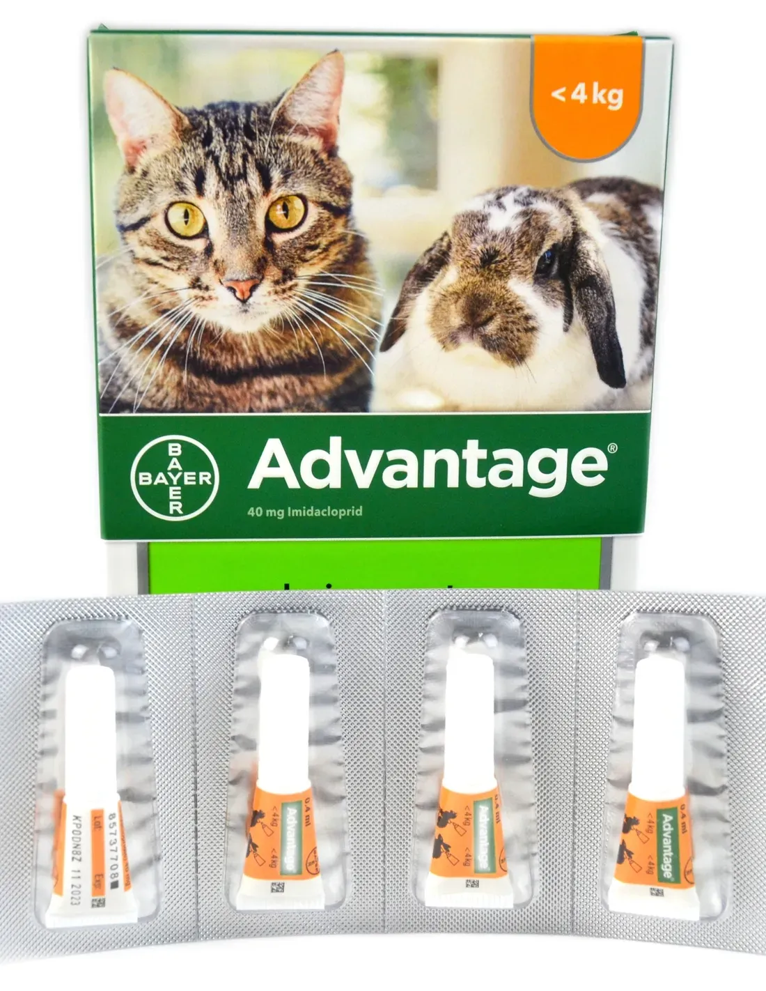 Kot/królik: < 4kg na sztukę; produkt: korzyść 40 dla małych kotów i małych królików; liczba pipet: 1 pipeta 0,4 ml; imidaklopryd (mg/kg mc): minimum 10 kotów/królik: = 4 kg mc;