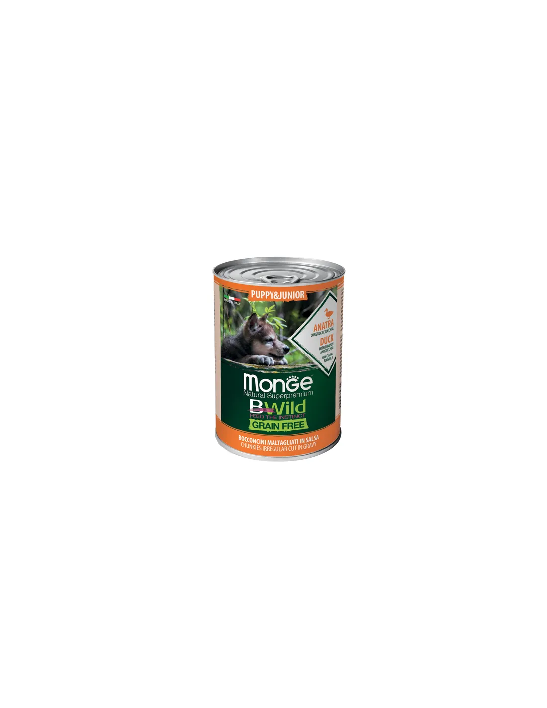 Monge naturalna formuła super premium bwild grain free dla szczeniąt i juniorów z dynią i cukinią to kompletna i zbilansowana karma dla szczeniąt od 1 miesiąca życia do osiągnięcia przez nie dorosłości. Formuła opracowana z myślą o dobrym samopoczuciu szczeniąt każdej wielkości, dzięki wyborowi alternatywnych źródeł węglowodanów niepochodzących ze zbóż, takich jak cukinia i dynia. Receptura została wzbogacona o prebiotyki najnowszej generacji, ksylooligosacharydy (xos), które wspomagają dobre samopoczucie jelit. Preparat wspiera prawidłowy wzrost stawów, dzięki zawartości glukozaminy i siarczanu chondroityny oraz zrównoważonemu stosunkowi wapnia i fosforu. Odpowiedni dla szczeniąt każdej wielkości.