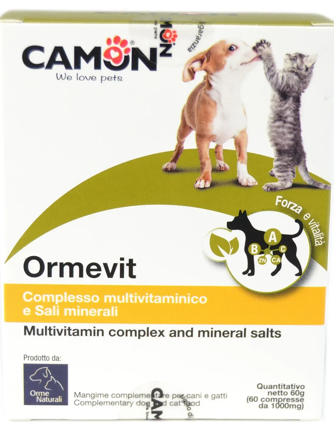 Poliwitamina dla psów i kotów. Pasza uzupełniająca oparta na witaminach z grup a, b, c, d, e, minerałach (żelazo, miedź, selen i cynk). Ponadto ormevit zawiera w swoim składzie ekstrakt z marchwi, algi spiruliny i drożdże piwne. Wsparcie dla: wzrostu; rekonwalescencja; stany niedożywienia; stres (szczepienia, zabiegi lecznicze, podróże, polowania, intensywna aktywność fizyczna, karmienie piersią, zmiany diety).
