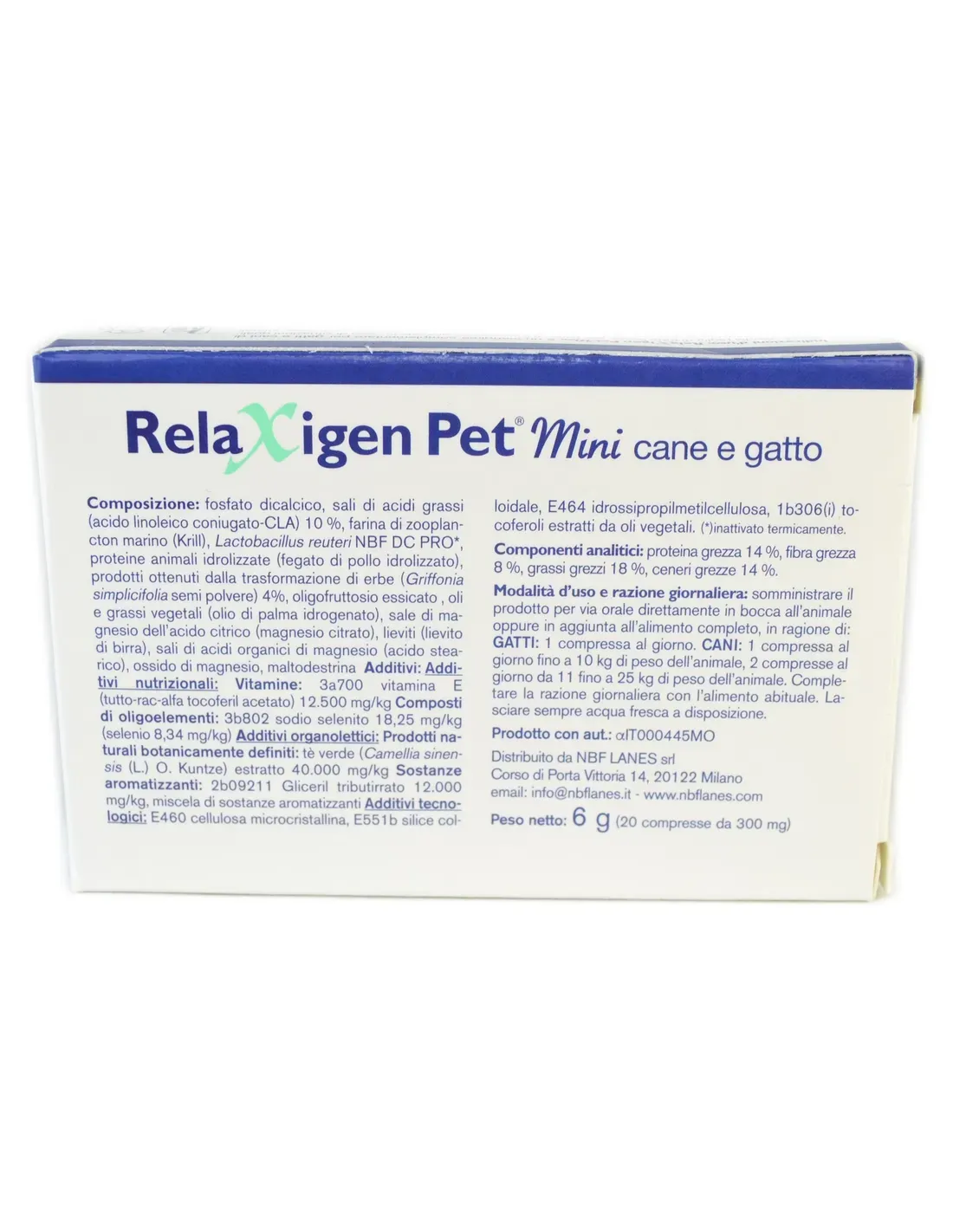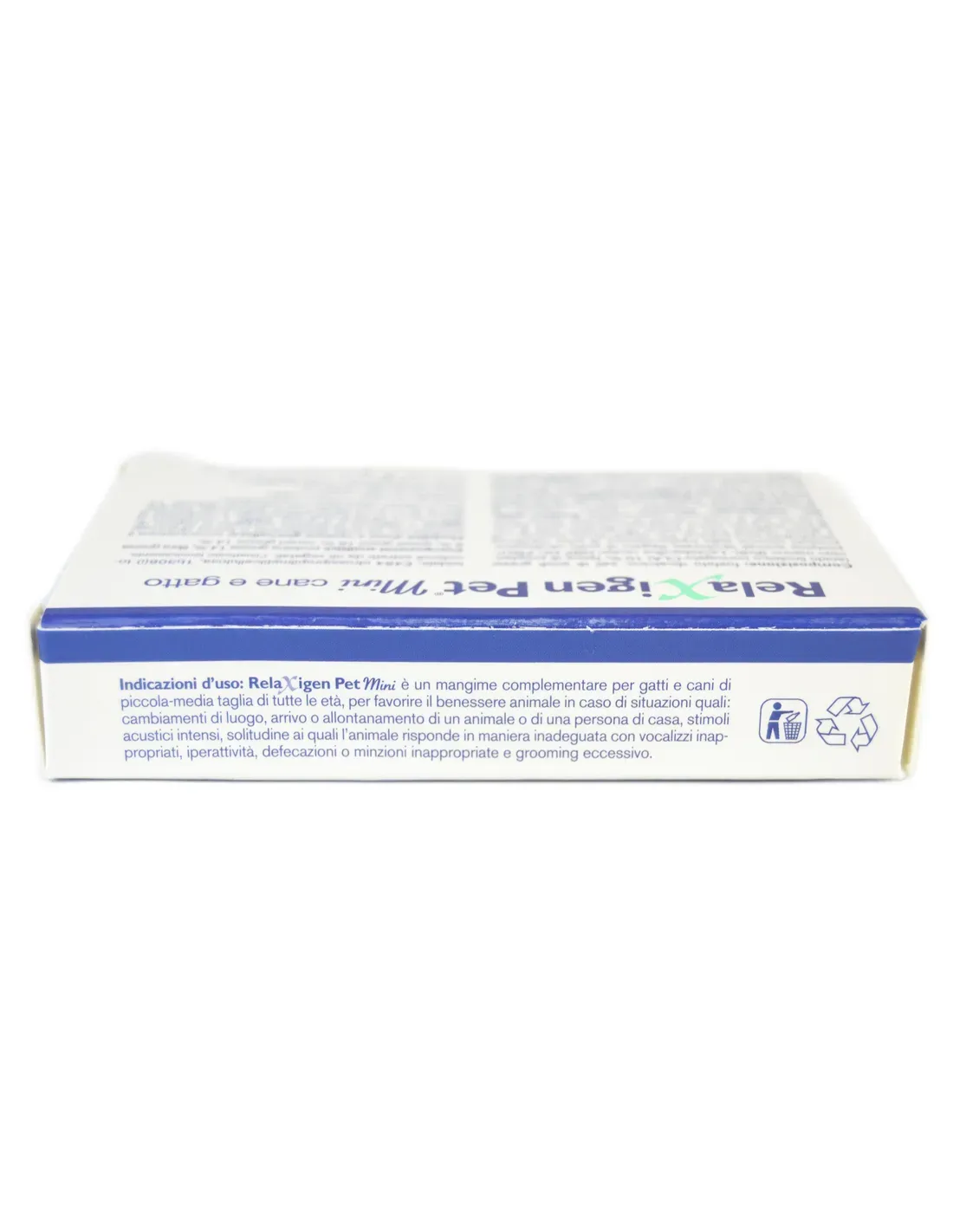 Relaxigen pet mini to suplement dla kotów oraz małych i średnich psów w każdym wieku, mający na celu poprawę ich dobrego samopoczucia w sytuacjach takich jak zmiana miejsca zamieszkania, przybycie lub opuszczenie zwierzęcia lub osoby z domu, intensywne bodźce akustyczne, samotność, na którą zwierzę niewłaściwie reaguje niewłaściwą wokalizacją, nadpobudliwość, niewłaściwe wypróżnianie lub oddawanie moczu, nadmierna pielęgnacja.
