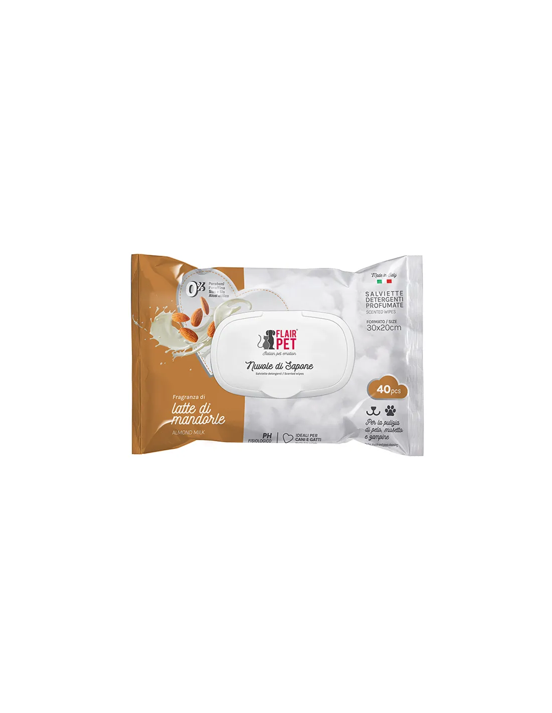 Chusteczki do czyszczenia Flair Pet Chmury mydła z mlekiem migdałowym 40 sztuk zostały stworzone, aby zaoferować praktyczne i delikatne rozwiązanie do codziennego czyszczenia Twojego zwierzaka. Chusteczki nasączone emulsją wzbogaconą mlekiem migdałowym, znanym ze swoich właściwości łagodzących i nawilżających, dzięki czemu idealnie nadają się do pielęgnacji skóry psów i kotów.