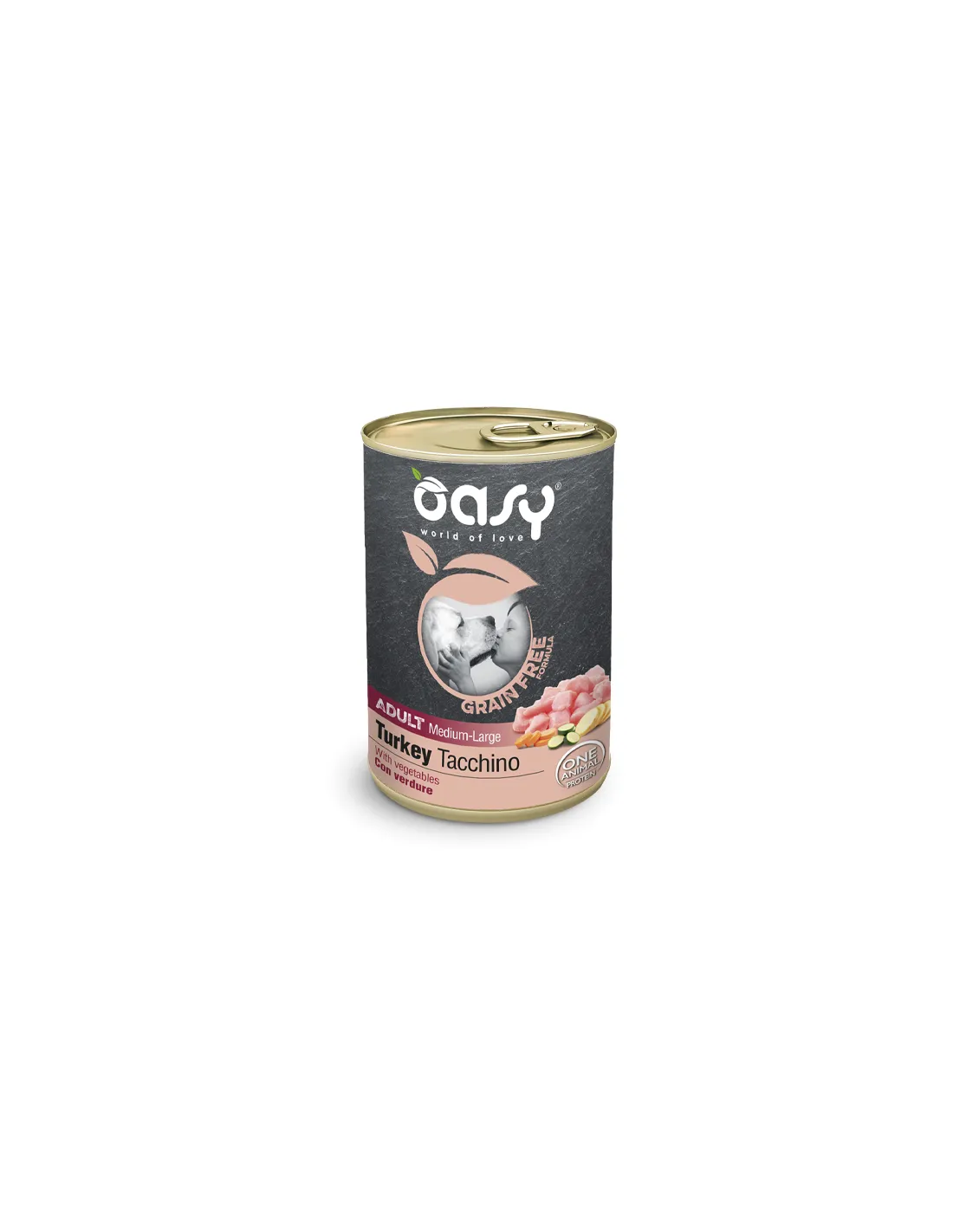 Oasy Adult Turkey to sucha karma dla dorosłych psów średnich i dużych rozmiarów, idealna dla psów powyżej pierwszego roku życia. Produkt ten nie zawiera zbóż i glutenu, co uwzględnia mięsożerną naturę psa. Dzięki wysokiej zawartości mięsa (50% indyka) zapewnia bardzo wysoką smakowitość i jest również doskonale dostosowana dla psów z wrażliwością pokarmową.