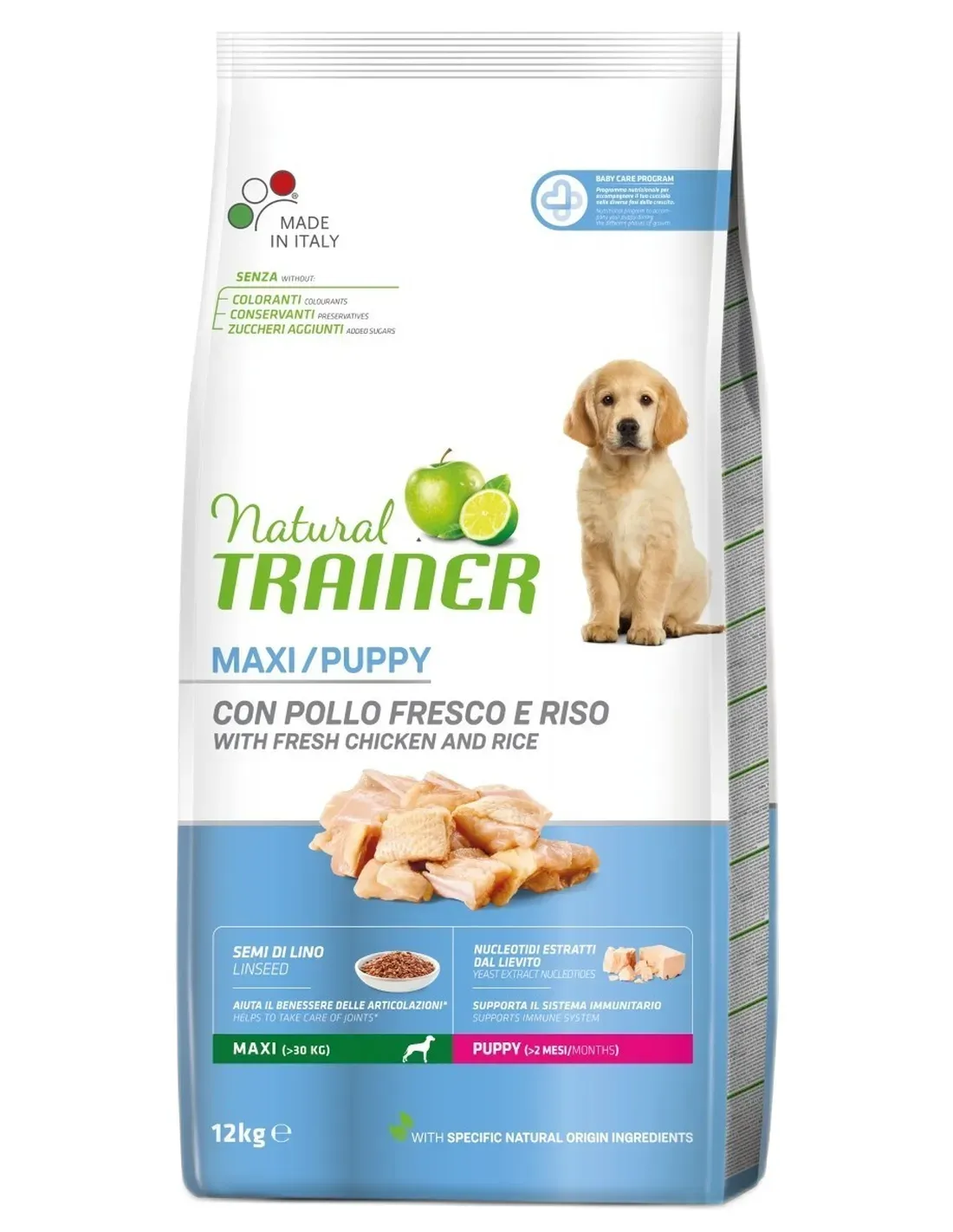 suszone białko z kurczaka i indyka 21%, świeży kurczak 18%, kukurydza, płatki kukurydziane, ryż 10%, tłuszcz pochodzenia zwierzęcego, białko kukurydziane, hydrolizowane białka zwierzęce, siemię lniane* 2%, pulpa buraczana*, olej rybny 1%, autolizowane drożdże, suszony ekstrakt z korzenia cykorii (źródło inuliny)* 0,7%, substancje mineralne, olej kukurydziany, lignoceluloza, MOS (mannanooligosacharydy)* 0,3%, suszone jabłka w proszku* 0,15%, koncentrat cytrynowy w proszku* 0,1%, algi morskie (Schizochytrium spp.)* 0,1%, bioaktywne peptydy kolagenowe 0,06%, ekstrakt drożdżowy (nukleotydy)* 0,05%., *Określić składniki pochodzenia naturalnego.