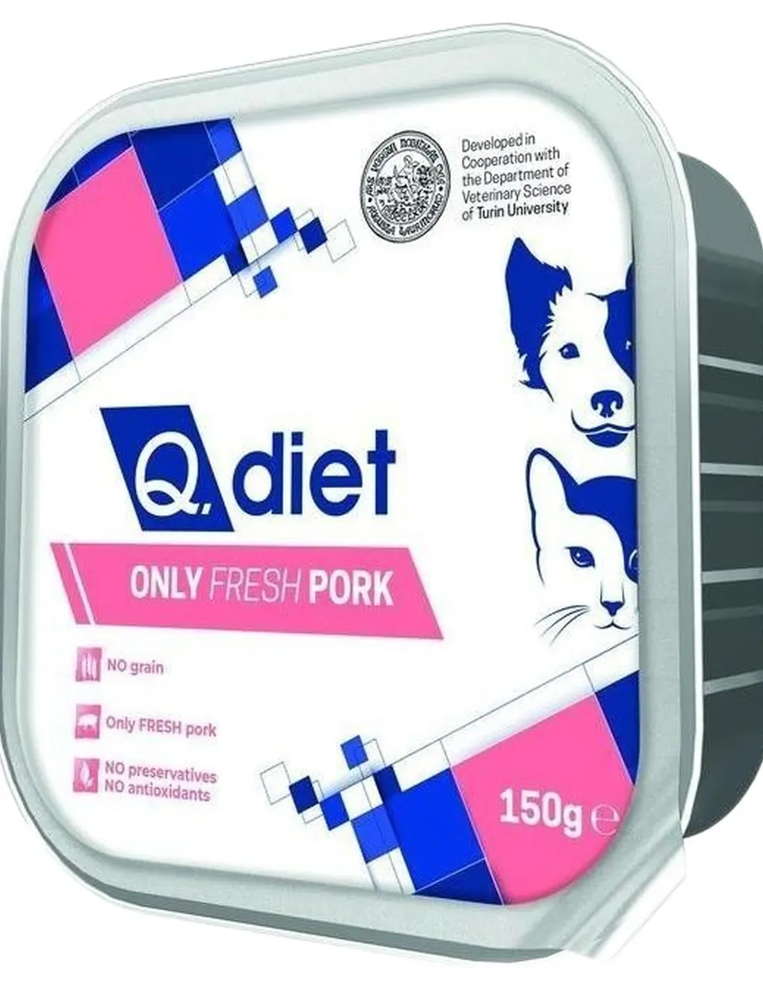 Głównym składnikiem Q.diet only Fresh wieprzowina 150 gr jest świeża wieprzowina, starannie wyselekcjonowana, aby zagwarantować maksymalną jakość i świeżość. Produkt nie zawiera zbóż, glutenu, syntetycznych dodatków, konserwantów i sztucznych barwników, dzięki czemu zapewnia pokarm naturalny i lekkostrawny. Skład został opracowany tak, aby zapewnić optymalną równowagę białek, tłuszczów i niezbędnych mikroelementów, ze szczególnym uwzględnieniem jakości białek zwierzęcych, jakie oferuje świeża wieprzowina, bogata w niezbędne dla dobrego samopoczucia psa aminokwasy. Istnieją również naturalne składniki wspomagające, które promują dobre trawienie i przyswajanie składników odżywczych, utrzymując równowagę flory jelitowej i przyczyniając się do silnego układu odpornościowego. W recepturze nie zastosowano mąk pochodzenia zwierzęcego ani składników niskiej jakości, co potwierdza jej wyższość w porównaniu z bardziej tradycyjną żywnością lub żywnością zawierającą dodatki.