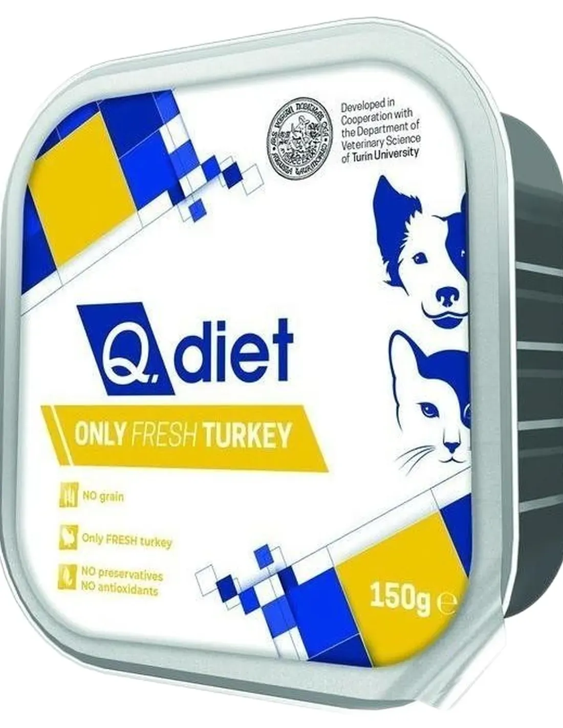 Q.diet Only Fresh Turkey to kompletny i zbilansowany posiłek dla wszystkich psów, zwłaszcza tych, które potrzebują diety wolnej od zbóż, glutenu i sztucznych składników. Jest szczególnie polecany w przypadku wrażliwości pokarmowej, alergii lub nietolerancji, dzięki prostemu i naturalnemu składowi na bazie świeżego indyka.