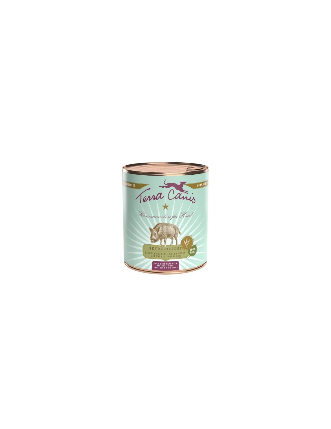 Kompletne mokre karmy Terra Canis przygotowywane są w tradycyjnej masarni w Monachium. Wszystkie składniki są w 100% klasy ludzkiej. Takie kompletne pożywienie zawiera świeże mięso (mięśnie), ale także serce i wątrobę (w małych ilościach). Ponadto kompletna karma Terra Canis Grain Free zawiera ponad 20 różnych rodzajów warzyw, owoców i ziół.
