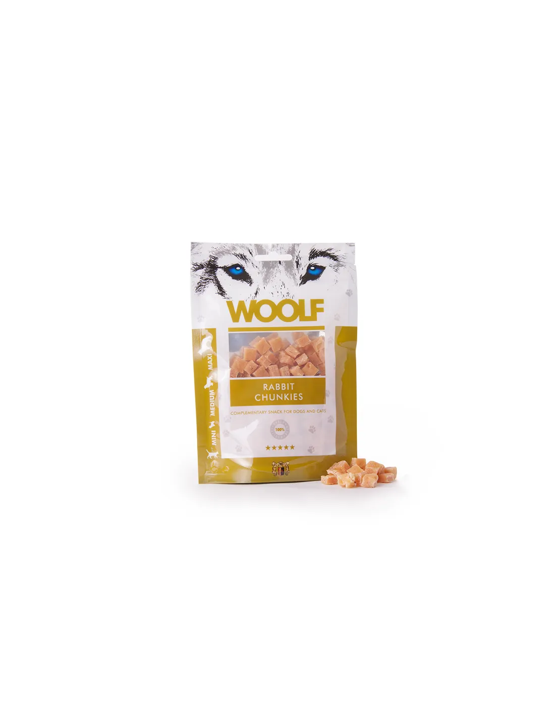 Woolf Snack Rabbit Chunks to karma uzupełniająca dla psów. Można go podawać jako nagrodę w trakcie treningu lub jako przekąskę pomiędzy posiłkami. Nie ma na celu zastąpienia pełnego posiłku.