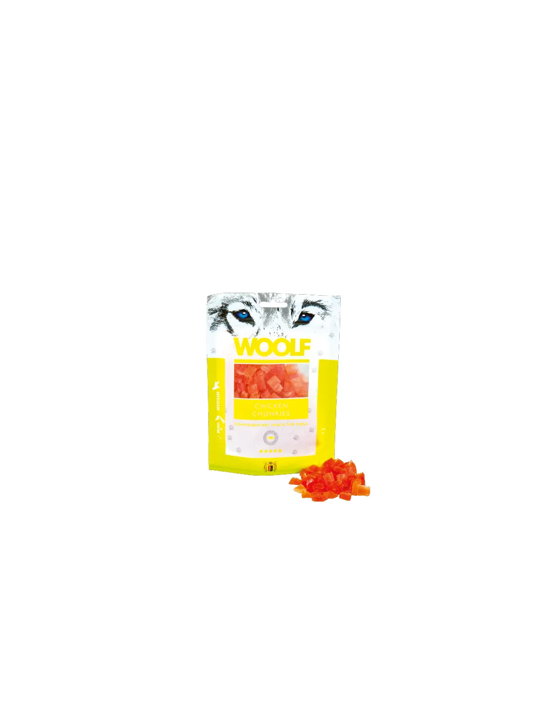 Produkt "Woolf Monoprotein Chicken Kawałki 100gr" to przekąska dla psów każdej wielkości. Są to nuggetsy z kurczaka i jagody, pakowane w 100 gramowe opakowanie. Ta jednobiałkowa przekąska składa się z wysokiej jakości składników, w tym kurczaka (96%) i gliceryny (0,5%).
