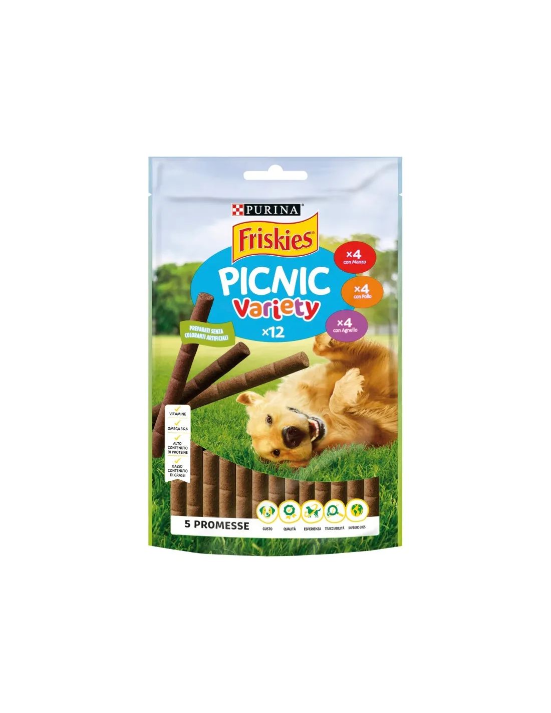 Purina Friskies Picnic Variety Snack Dogs Wołowina, Kurczak i Jagnięcina to pyszna i pożywna przekąska dla Twojego czworonożnego przyjaciela. Ta przekąska jest dostępna w trzech smacznych odmianach: wołowina, kurczak i jagnięcina, dzięki czemu Twój pies może cieszyć się różnorodnością smaków.