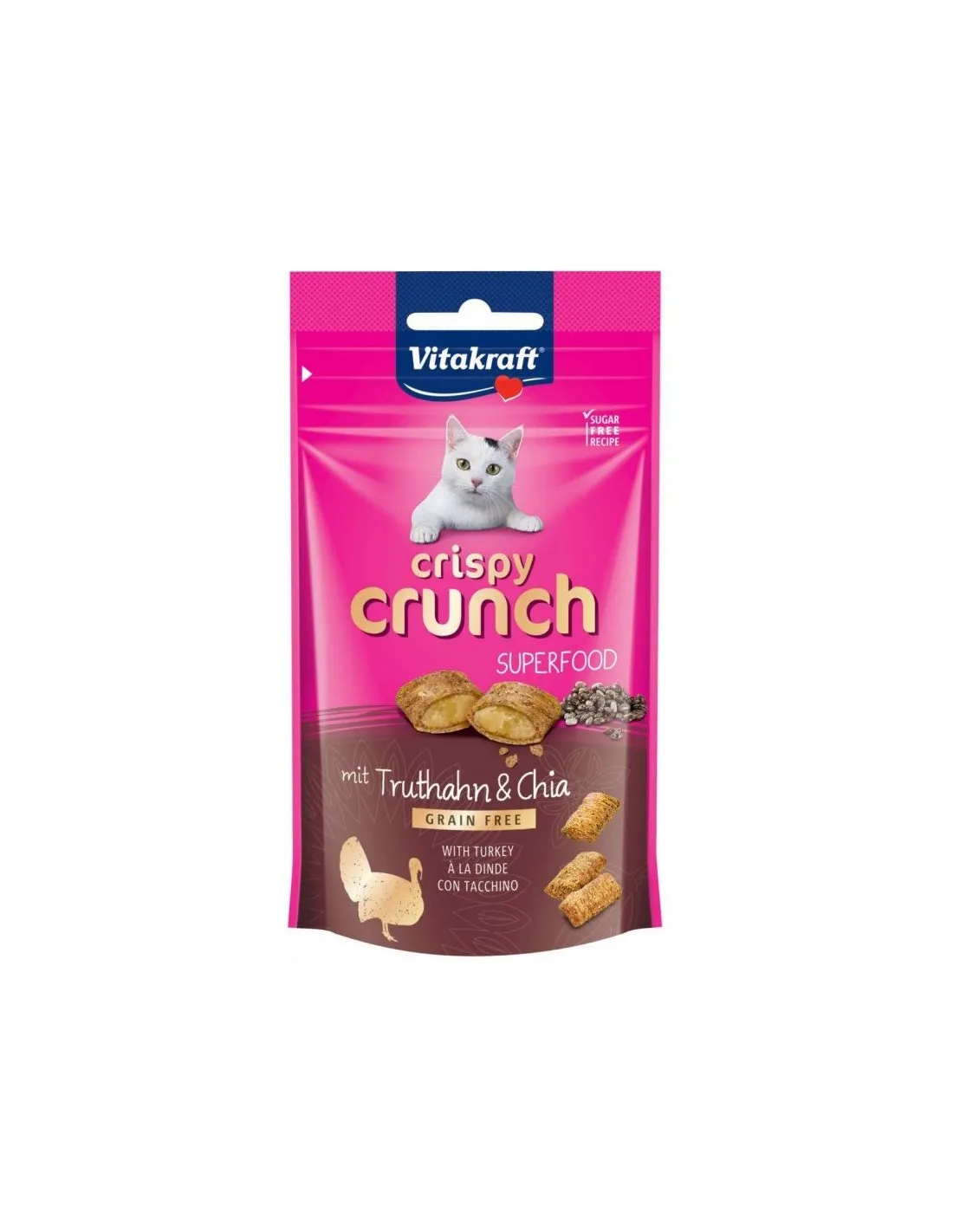 Vitakraft Crispy Crunch Superfood z Indykiem i Nasionami Chia to wysokiej jakości przekąska dla kota. Te chrupiące przekąski mają pyszne kremowe nadzienie z indyka i nasion chia. Nie zawierają cukru i zbóż, dzięki czemu są odpowiednie nawet dla kotów z nietolerancją tych składników.