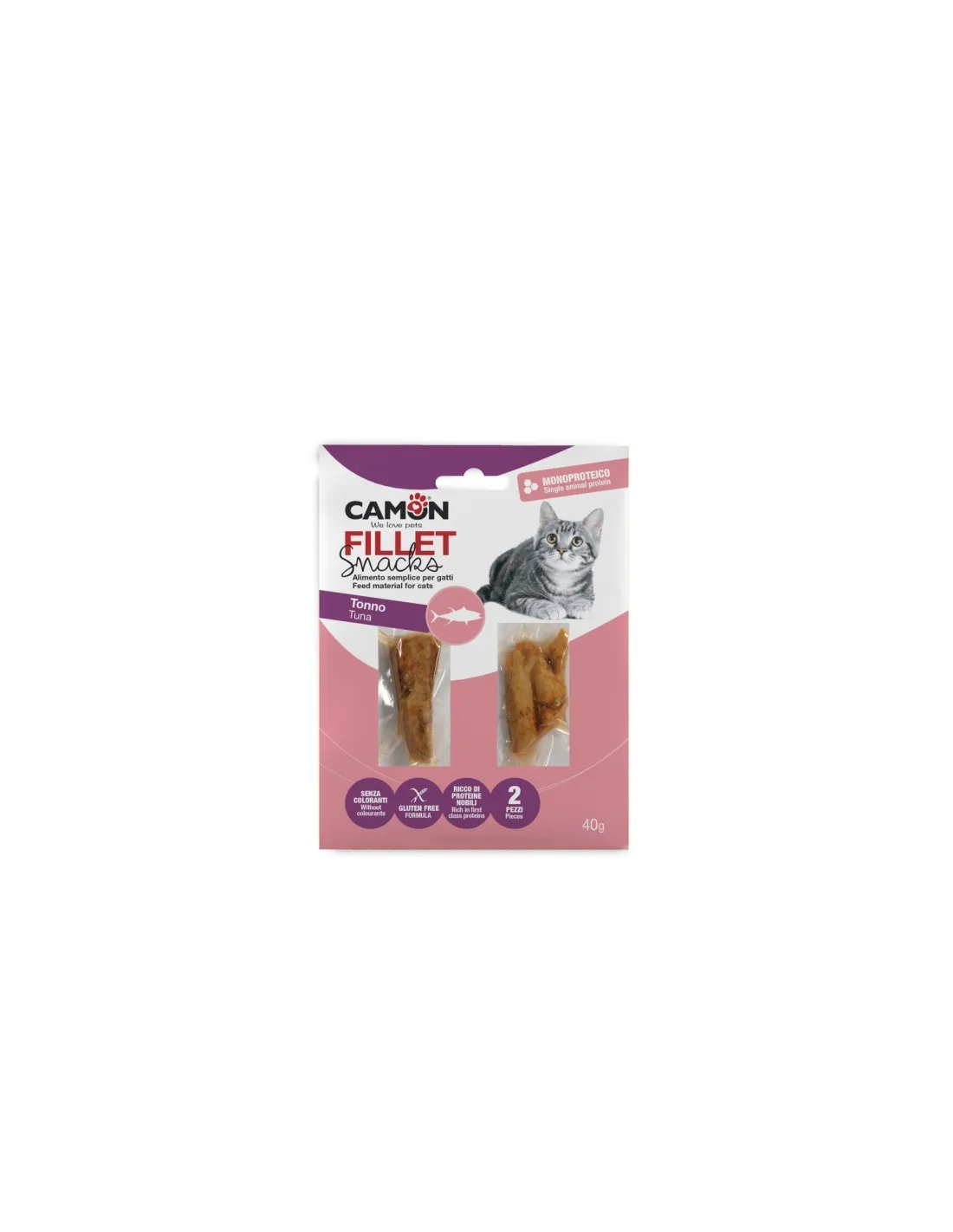 "Camon Tuna Filets 40g" można podawać jako przekąskę pomiędzy posiłkami lub jako część głównego posiłku Twojego kota. Dzięki konsystencji do żucia produkt ten jest łatwy do spożycia dla kotów w każdym wieku.