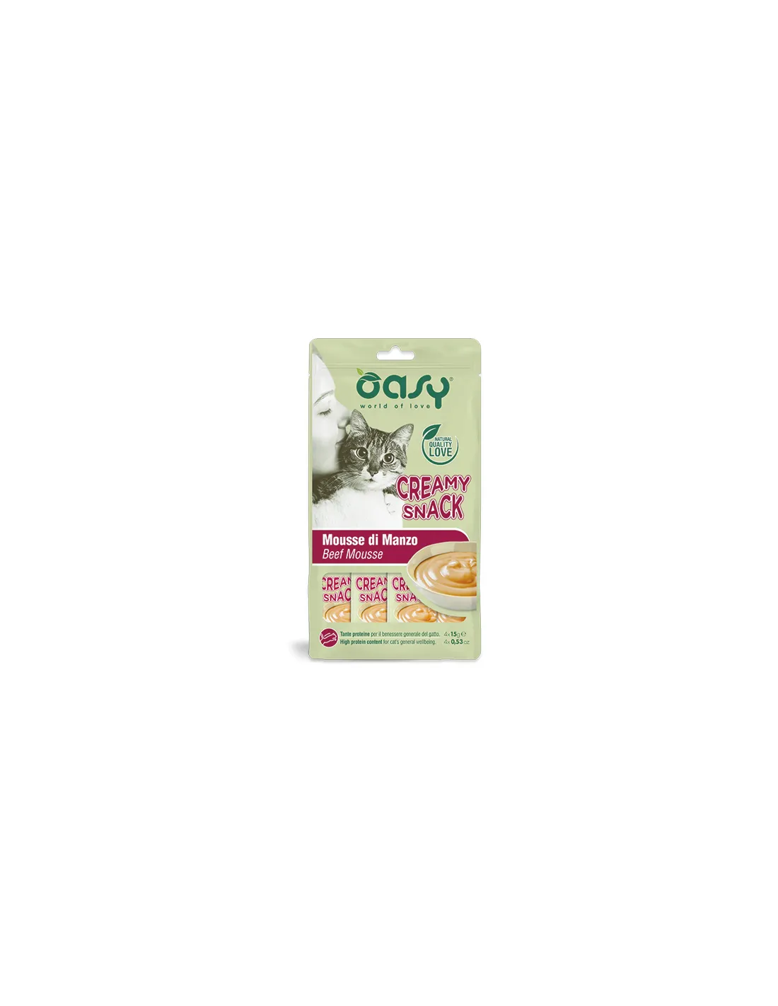 Oasy Cat Creamy Snack Beef 4x15g to kremowa i pyszna przekąska stworzona z myślą o ogólnym dobrostanie Twojego kota. Ten mus wołowy jest bogaty w białko i opracowany tak, aby był nieodparcie smaczny i pożywny.