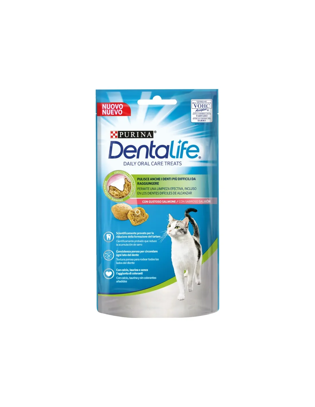 PURINA DENTALIFE CAT SNACK SALMON 40G BAG to innowacyjna przekąska dla dorosłych kotów, stworzona z myślą o wspieraniu codziennej higieny jamy ustnej Twojego kota. Ta przekąska nie tylko zachwyca podniebienie łososiowym smakiem, ale także posiada porowatą i chrupiącą konsystencję, która pomaga oczyścić zęby, docierając nawet do tych najtrudniejszych do czyszczenia. Udowodniono naukowo, że jego unikalna formuła ogranicza powstawanie kamienia nazębnego, pomagając w ten sposób zachować zdrowe zęby i dziąsła kota.
